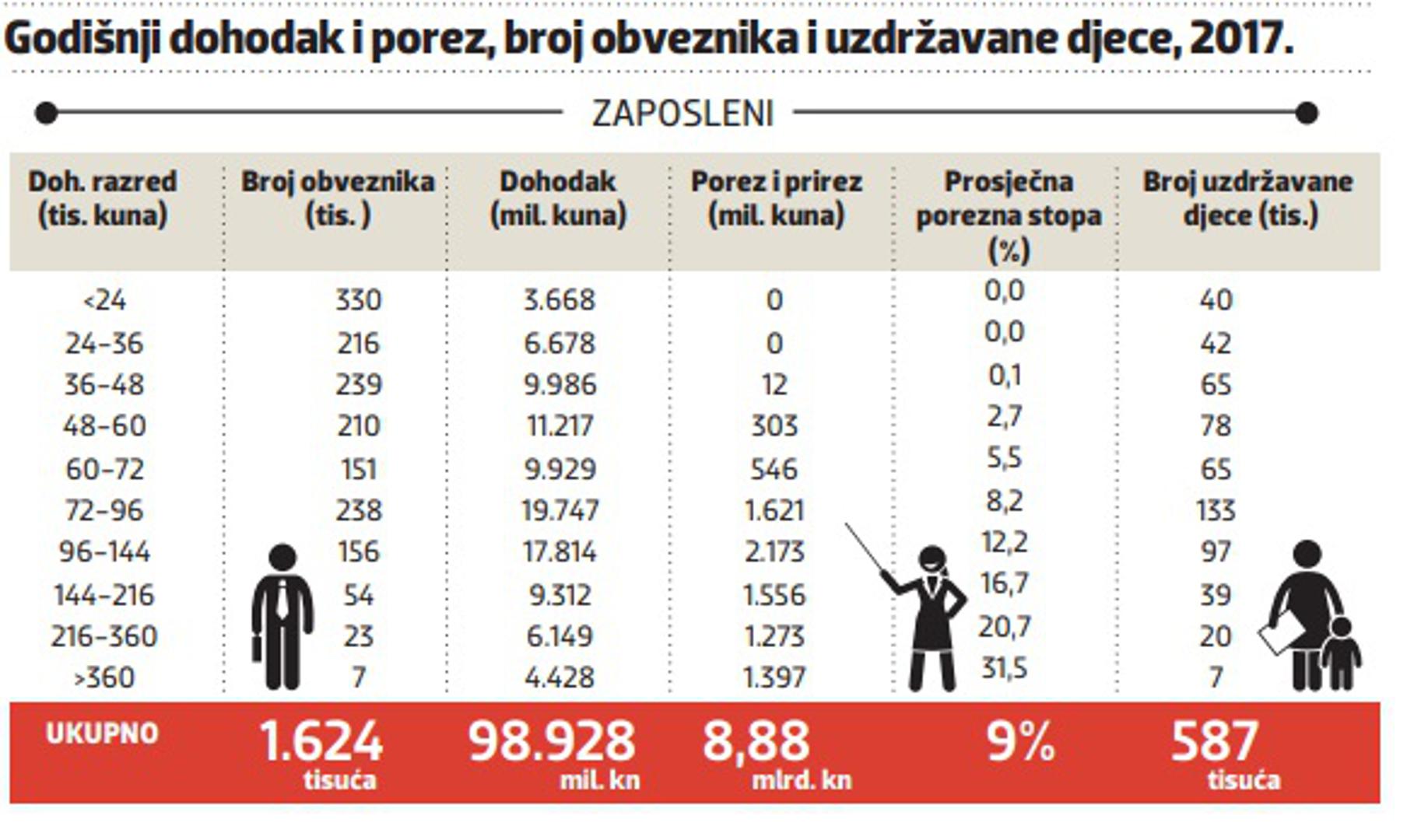 Prema toj bazi, Hrvatska je tada imala oko sedam tisuća zaposlenih, pretpostavlja se menadžera, političara i drugih osoba na dobro plaćenim pozicijama, čiji su godišnji dohoci veći od 360 tisuća kuna, odnosno veći od 52 tisuće kuna mjesečno. No, trećina dohotka te skupine građana odlazi na porez i prirez! Zaposleni čiji su mjesečni dohoci od 22.000 do 52 tisuće kuna u prosjeku državi ostavljaju petinu za porez i prirez, dok je efektivna stopa poreza na dohodak koju plaća 55 tisuća zaposlenih čiji su mjesečni dohoci od 12.000 do 22 tisuće kuna oko 16 posto. Dohodak je inače iznos plaće koji preostane kad se plate mirovinski doprinosi, a ostatak se ove godine oporezuje sa stopama 24 i 36 posto nakon što se iskoriste neoporezivi dio i olakšice za djecu i druge uzdržavane članove obitelji.