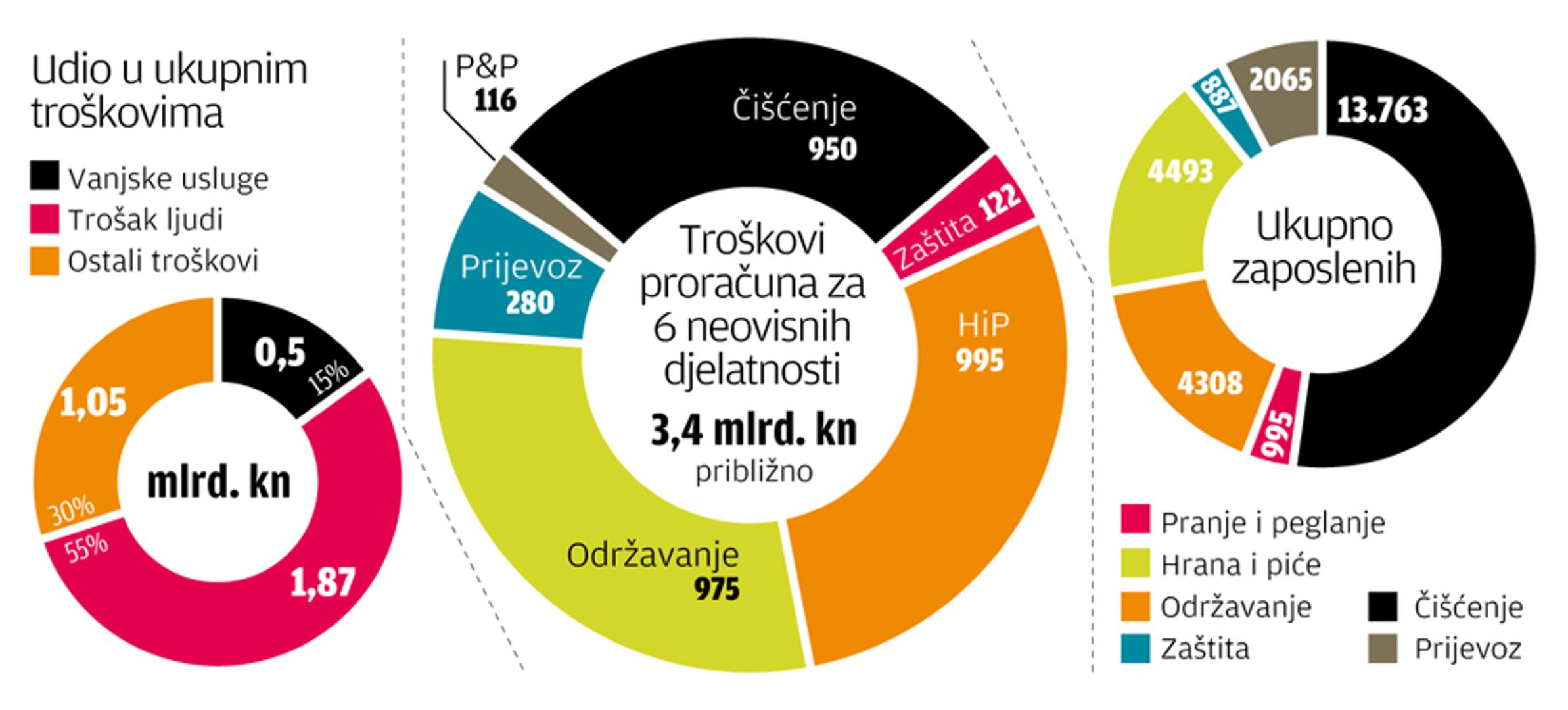 Vlada tvrdi da nitko neće ostati bez posla i da će u novu tvrtku, koja bi se trebala osnovati početkom iduće godine, ući s identičnim ugovorima o radu i pravima koja imaju i danas. Potpredsjednica Vlade Milanka Opačić procjenjuje da će se u prvoj fazi ostvariti uštede od oko 280 milijuna kuna na godinu. U tu novu državnu megatvrtku neće ući svih 24 tisuće radnika odjednom nego u fazama – a posljednji radnici iz zdravstvenog sustava. Dio od 26.500 ukupno zaposlenih na pratećim poslovima neće u novu tvrtku. Zaštitare će prebaciti u postojeće državno društvo AKD-Zaštita, a svi vozači prijeći će u zajedničku službu na razini Ureda za opće poslove Vlade i Sabora. M. Opačić tvrdi da model spin offa nije izabran zbog pritiska sindikata koji se protive outsourcingu. – Nismo se ni zaletjeli niti smo od ičega odustali. Od tri modela koja smo razmatrali izabrali smo spin off jer tu država ima najviše iskustva, a taj je model i najmanje stresan za djelatnike – tvrdi.