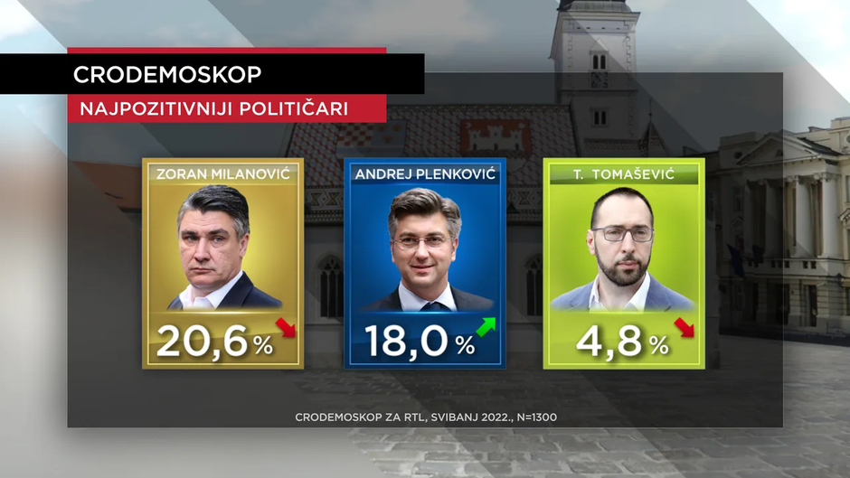 Najbolje i u svibnju stoji predsjednik Milanović s gotovo 21 posto potpore, no u travnju je imao i 22 te mu je od veljače ovo najlošiji rejting. Drugi izbor je premijer Plenković kojem je pak u odnosu na travanj rejting viši za gotovo 3 postotna boda (svibanj 18 posto - travanj 15,5 posto). Svi ostali su daleko, a broncu na ovoj ljestvici zadržao je zagrebački gradonačelnik, s manje od 5 posto (u travnju bio na 5,5 posto).