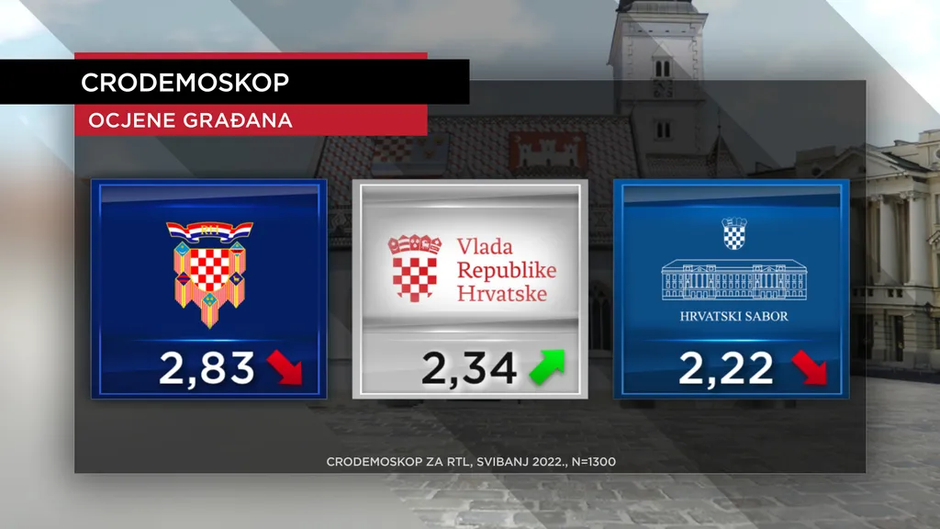 Iako je Pantovčak ponovno dobio najbolju ocjenu, dobar - tri, ovo je najlošiji prosjek od početka predsjedničkog mandata (svibanj 2,83 - travanj 3). Vlada je nakon rekonstrukcije nešto poboljšala prosjek od travnja ali ostali su na dovoljan - dva (svibanj 2,34 - travanj 2,31). Istu ocjenu s nižim prosjekom građani su dali i parlamentu (svibanj 2,34 - travanj 2,31).