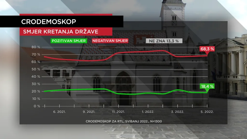 Tek nešto više od 18 posto ispitanika smatra da zemlja ide u dobrom smjeru, a 68,3 posto smjer ocjenjuje pogrešnim (prošlog mjeseca je bilo manje od 18,6 posto optimističnih, a 67,6 posto ispitanika smatralo je da idemo u pogrešnom smjeru). Optimistični su najčešće glasači vladajućeg HDZ-a (52,5 posto), ali i među njima 31,8 posto smatra da idemo u pogrešnom smjeru.