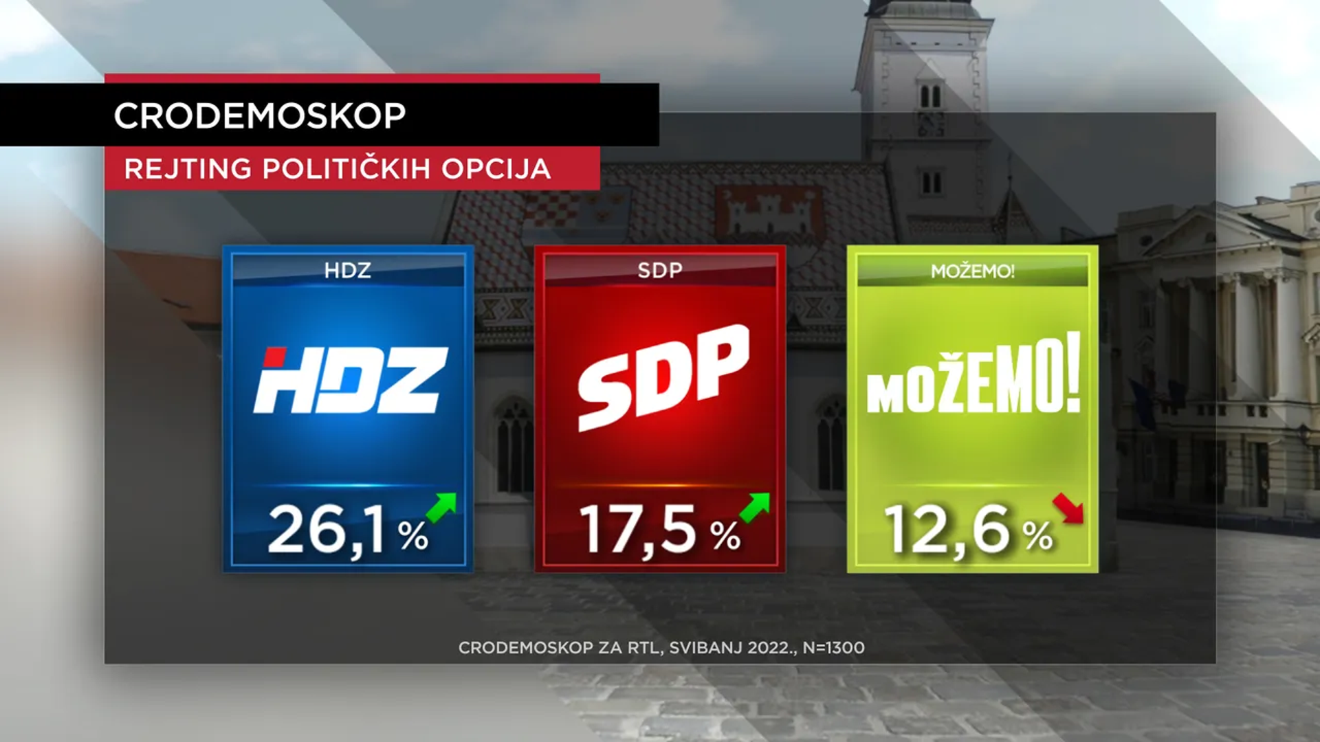 Vladajući HDZ i dalje je prvi izbor među ispitanicima. Više od četvrtine građana tu stranku smatra najboljom na političkoj sceni i to uz blagi rast u odnosu na travanj (svibanj 26,1 posto - travanj 25,4 posto). Rast bilježi i SDP iako i dalje značajno zaostaju (svibanj 17,5 posto - travanj 17,1 posto). Treća opcija ostaje platforma MOŽEMO! koja vlada Zagrebom gotovo godinu dana; u svibnju su na 12,6 posto (travanj 12,8 posto).