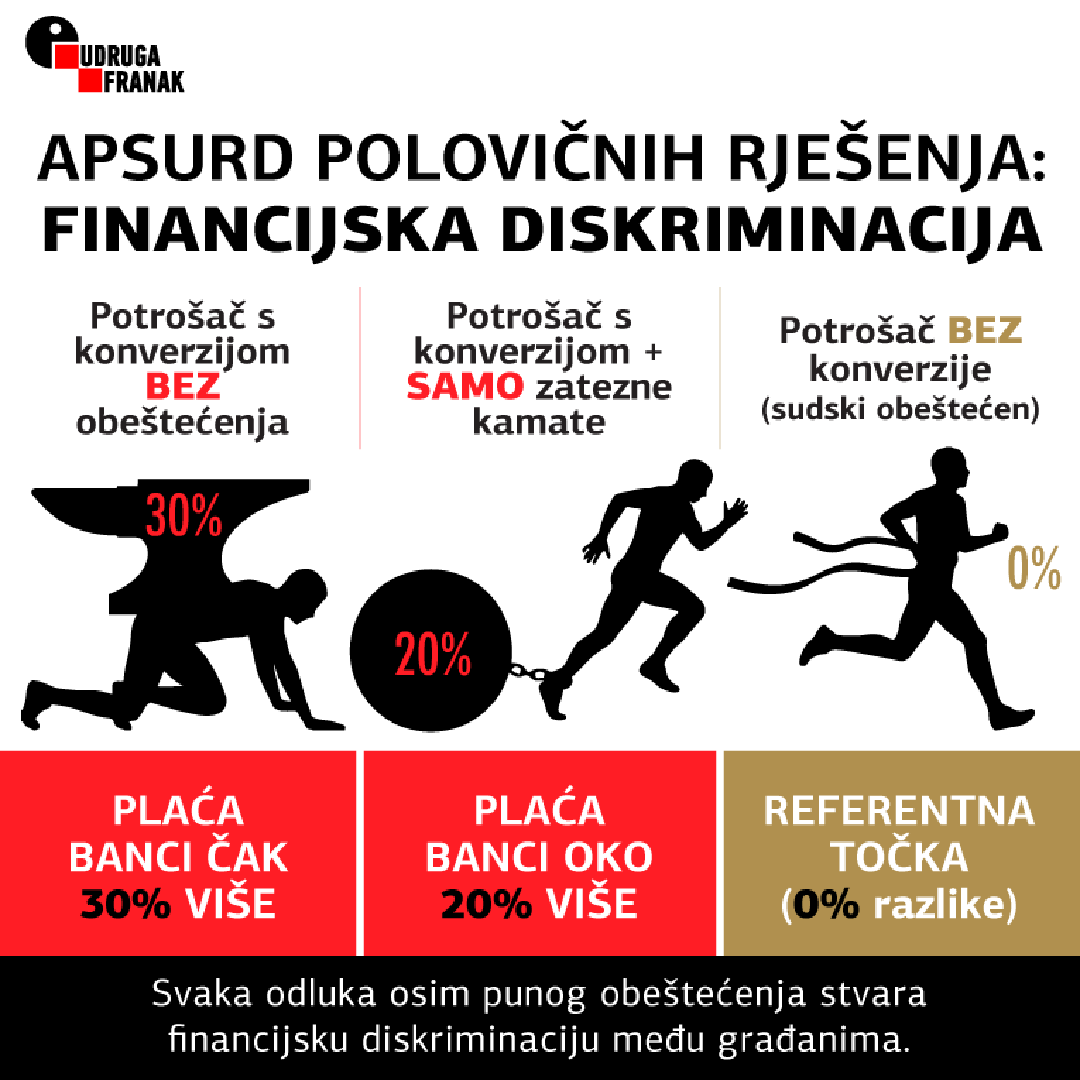 - Potrošač koji je konvertirao kredit bez punog sudskog obeštećenja na kraju otplaćuje u ukupnom iznosu čak oko 30 % više od potrošača koji nije konvertirao CHF kredit, ali je sudski obeštećen odnosno oko 20 % više, ako bi Vrhovni sud RH na kraju potrošaču s konvertiranim CHF kreditom dosudio samo pravo na zatezne kamate.
