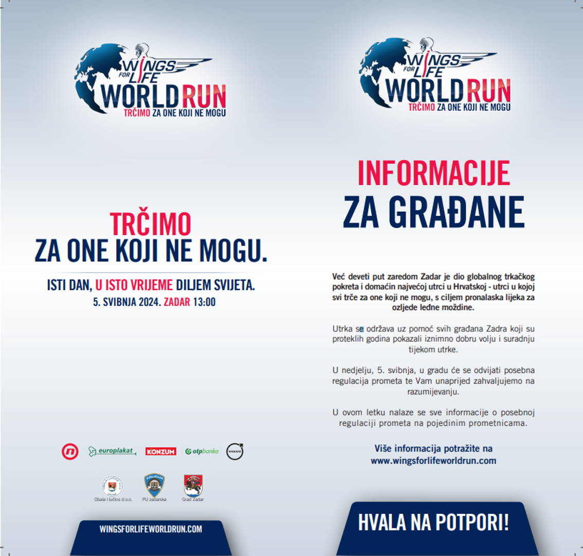 U nedjelju, 5. svibnja, s Liburnske obale u Zadru startat će novo izdanje utrke Wings for Life World Run - izvjestili su iz zadarske gradske uprave. Ova tradicionalna međunarodna utrka kojom se prikupljaju sredstva za istraživanje liječenja ozljeda leđne moždine od svog prvog izdanja održava se u Zadru, a ove godine i u još 6 europskih gradova kroz službene utrke na lokaciji: Beč (AUT), München (GER), Poznan (POL), Prag (CZE), Ljubljana (SLO), Zug (SUI). Naravno, utrke uz aplikaciju održavaju se na mnogim drugim lokacijama pa tako cijeli svijet kreće istovremeno s utrkom za one koji ne mogu.
