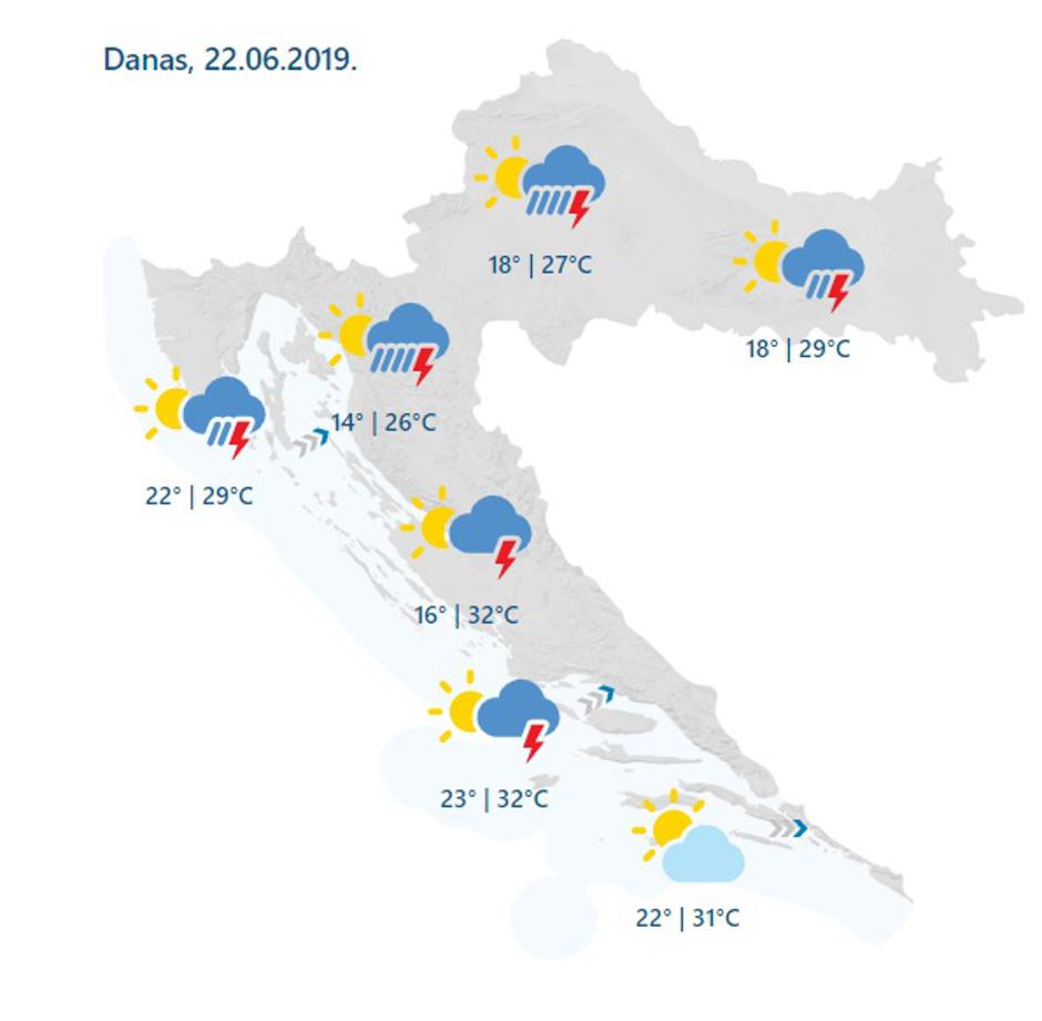 U gorskoj Hrvatskoj i na sjevernom Jadranu također vrlo nestabilno te od jutra oblačnije, a kako će dan odmicati, mjestimična kiša, pljuskovi i grmljavina bit će češći. Temperatura zraka bit će samo za koji stupanj niža, prognoza je DHMZ-a.