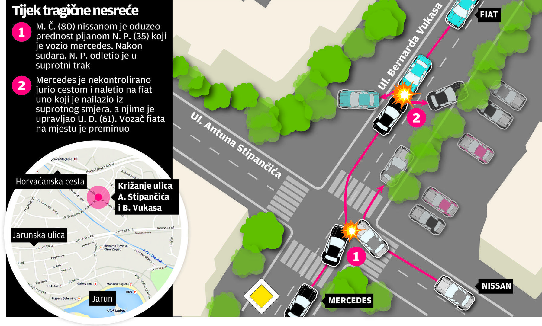 Nesreći je kumovalo i to što je N. P. (35) u Mercedesu sa 1,66 promila u krvi nastojao izbjeći sudar s Nissanom koji je dolazio baš iz Stipančićeve, a za čijim je volanom bio M. Č. (80). Iako je 35-godišnjak u Mercedesu imao prednost prolaska, vozač Nissana očito ga nije na vrijeme uočio. Mercedes se odbio u suprotni trak i udario u Fiat i nesretnog U. D.