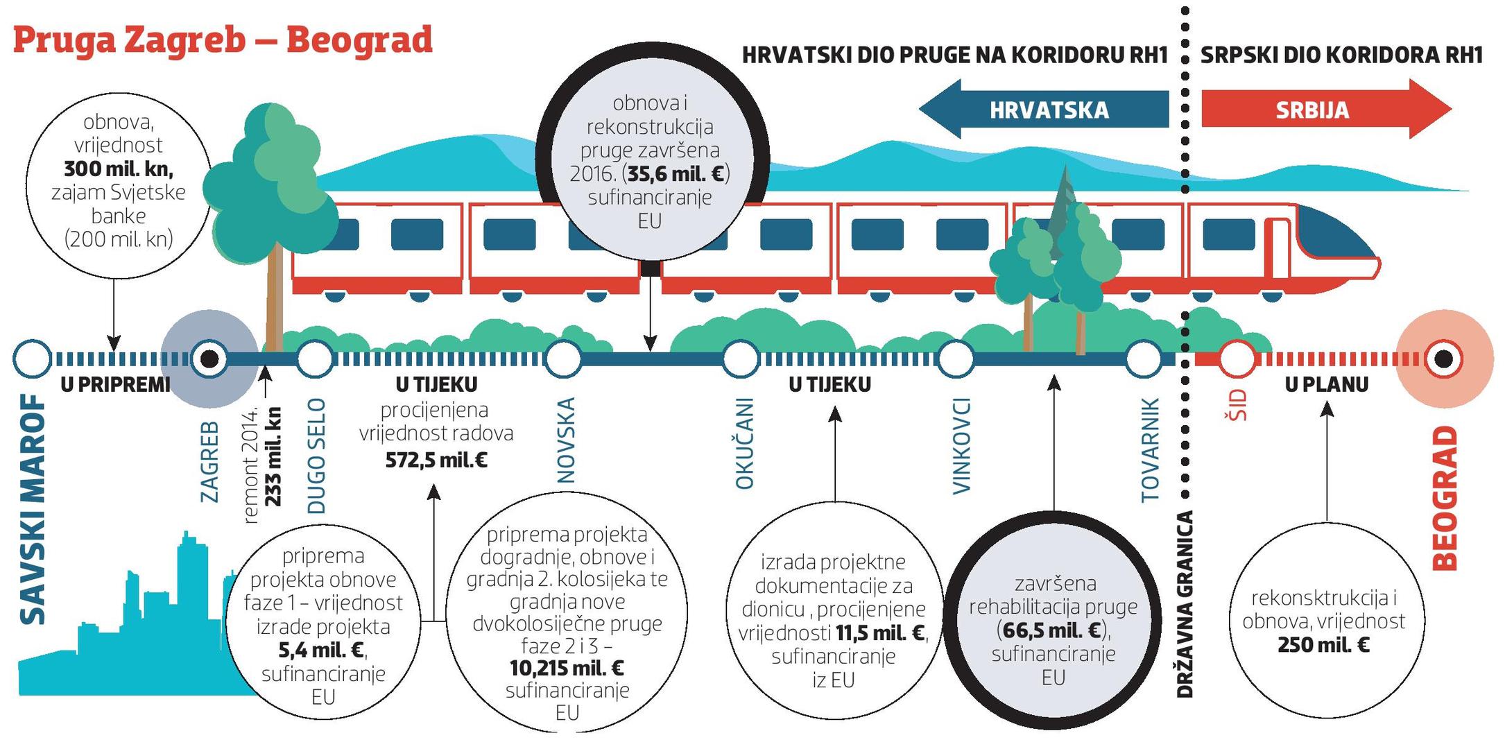 Pruga Zagreb – Beograd dio je paneuropskog koridora RH1 koji se proteže od Salzburga, preko Ljubljane, Zagreba, Beograda i Skopja do Soluna. Pruga od Beograda do Zagreba duga je 412 kilometra, bila je elektrificirana još 1970. i većim dijelom je dvokolosiječna, osim dionice Dugo Selo – Novska. Prije rata bila je žila kucavica gospodarstva, svi teretni vlakovi iz Zapadne Europe koji su išli prema istoku prometovali su tim koridorom. Rat ih je otjerao na druge, pruge – mađarske, rumunjske, bugarske. Vinkovci su, primjerice, prije rata bili jedno od najvećih željezničkih čvorišta u Europi, a sad to čvorište vapi za vlakovima. Putovanje vlakom između Zagreba i Beograda traje oko šest i pol sati i sad je sat vremena dulje nego prije rata. U HŽ Putničkom prijevozu kažu da trenutačno između ta dva grada prometuje jedan par vlakova svakodnevno na relaciji Beograd – Zagreb – Zürich – Beograd. Usto još jedan par vlakova sezonski vozi svakodnevno na relaciji Beograd – Zagreb – Ljubljana – Beograd.