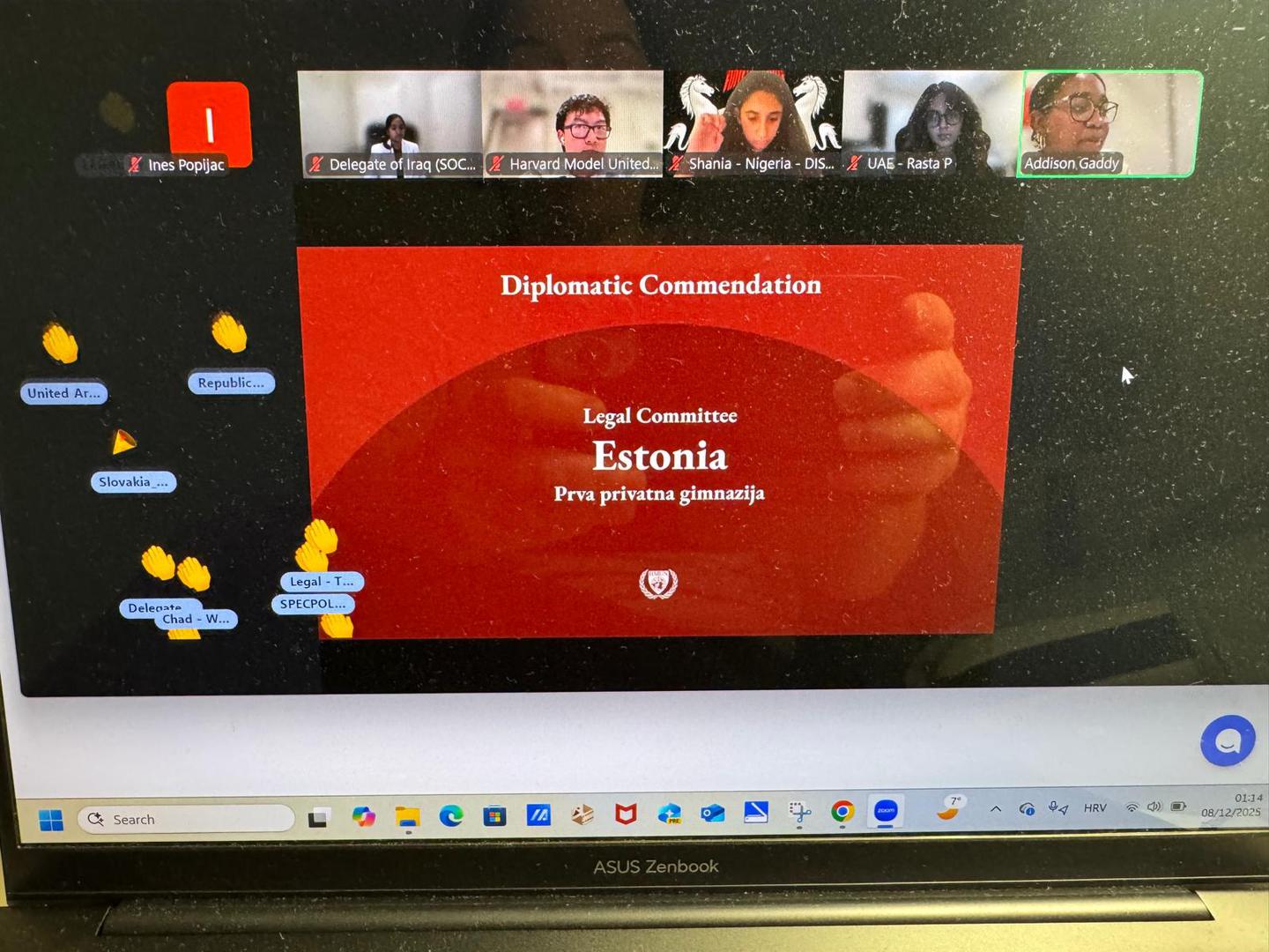 Učenici Prve privatne gimnazije s pravom javnosti iz Zagreba imali su čast 16. godinu za redom sudjelovati na međunarodnoj konferenciji Harvard Model United Nations – najprestižnijoj svjetskoj simulacijskoj debati u organizaciji studenata glasovitog Sveučilišta Harvard, koja se održala online ovog vikenda.