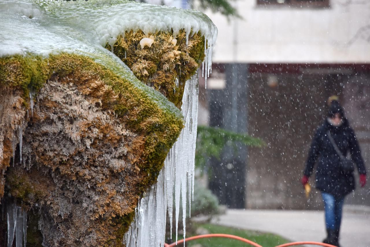 Niske temperature zaledile su fontanu ispred šibenske crkve Gospe van Grada, a na rivi je bilo i snježnih pahulja.