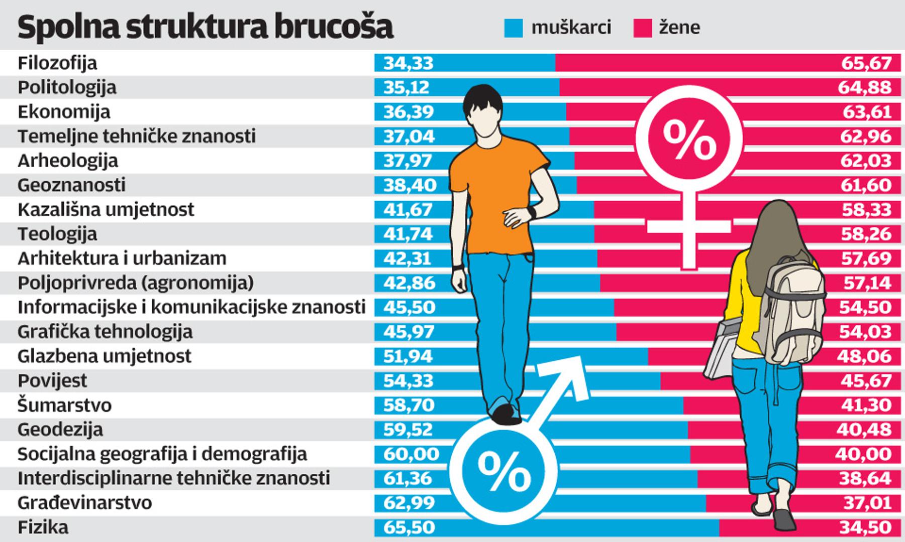 Čak su i na studiju matematike u manjini – tamo ih je oko 32 posto. Ipak, postoje studiji gdje su muškarci u većini. Na studijskim programima zrakoplovstva, raketne i svemirske tehnike žena uopće nema, a izrazito malo ih je na strojarstvu, elektrotehnici, računarstvu, brodogradnji, rudarstvu, drvnoj tehnologiji, kineziologiji, metalurgiji... Pojednostavnjeno gledano, žene dominiraju na studijima koji ih obrazuju za zanimanja u kojima će komunicirati s ljudima, dok muškarci izabiru zanimanja u kojima će biti okrenuti prema sebi i tehnici. Zašto je to tako, može se samo nagađati.