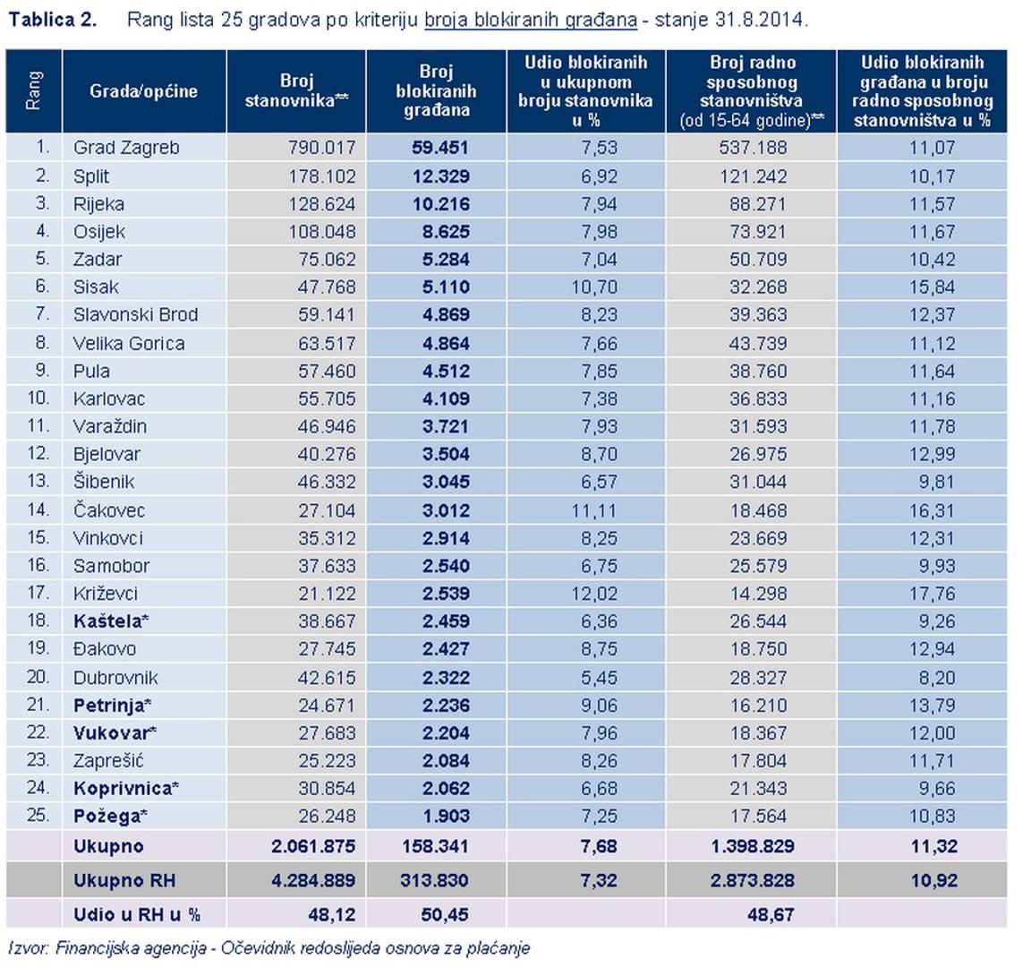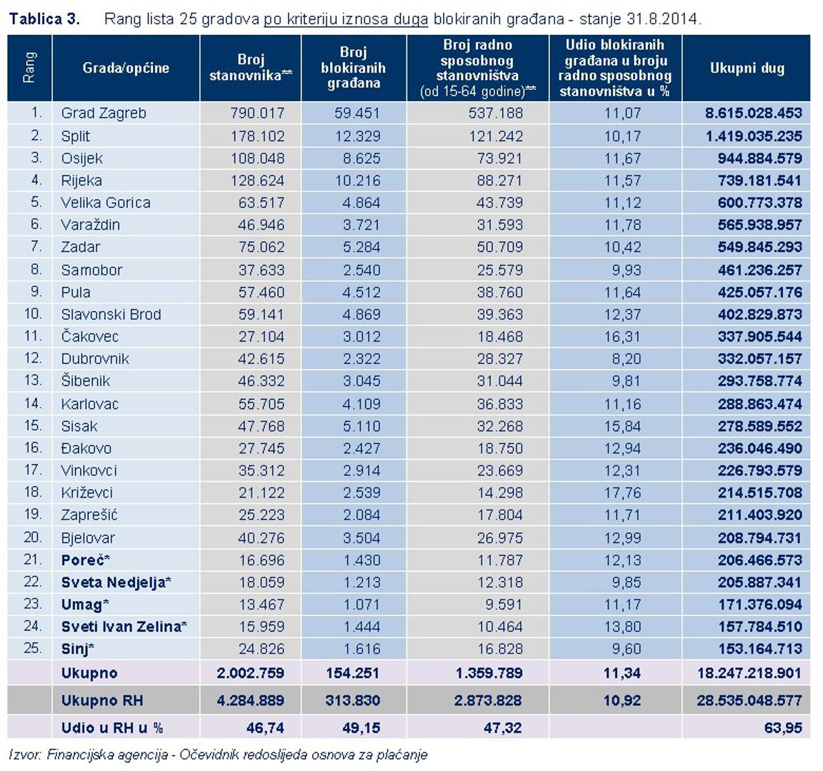 – Analiza dospjelih nepodmirenih obveza građana, stanje na dan 31. kolovoza 2014. godine, pokazala je da se prema broju blokiranih građana u odnosu na broj stanovnika, izdvajaju grad Križevci sa 12,02%, Čakovec sa 11,11% i Sisak sa 10,70% blokiranih građana. Prema prosječnom iznosu duga, najviše su blokirani građani Samobora, čiji prosječan dug iznosi 182.000 kuna, a slijede ih građani Svete Nedjelje s dugom od 170.000 kuna, dok su blokirani građani u preostala 23 grada s rang-liste 25 gradova po kriteriju iznosa duga blokiranih građana, u prosjeku dužni od 55.000 kuna, građani Siska, do 160.000 kuna, građani Umaga – navodi na svojim stranicama Fina.