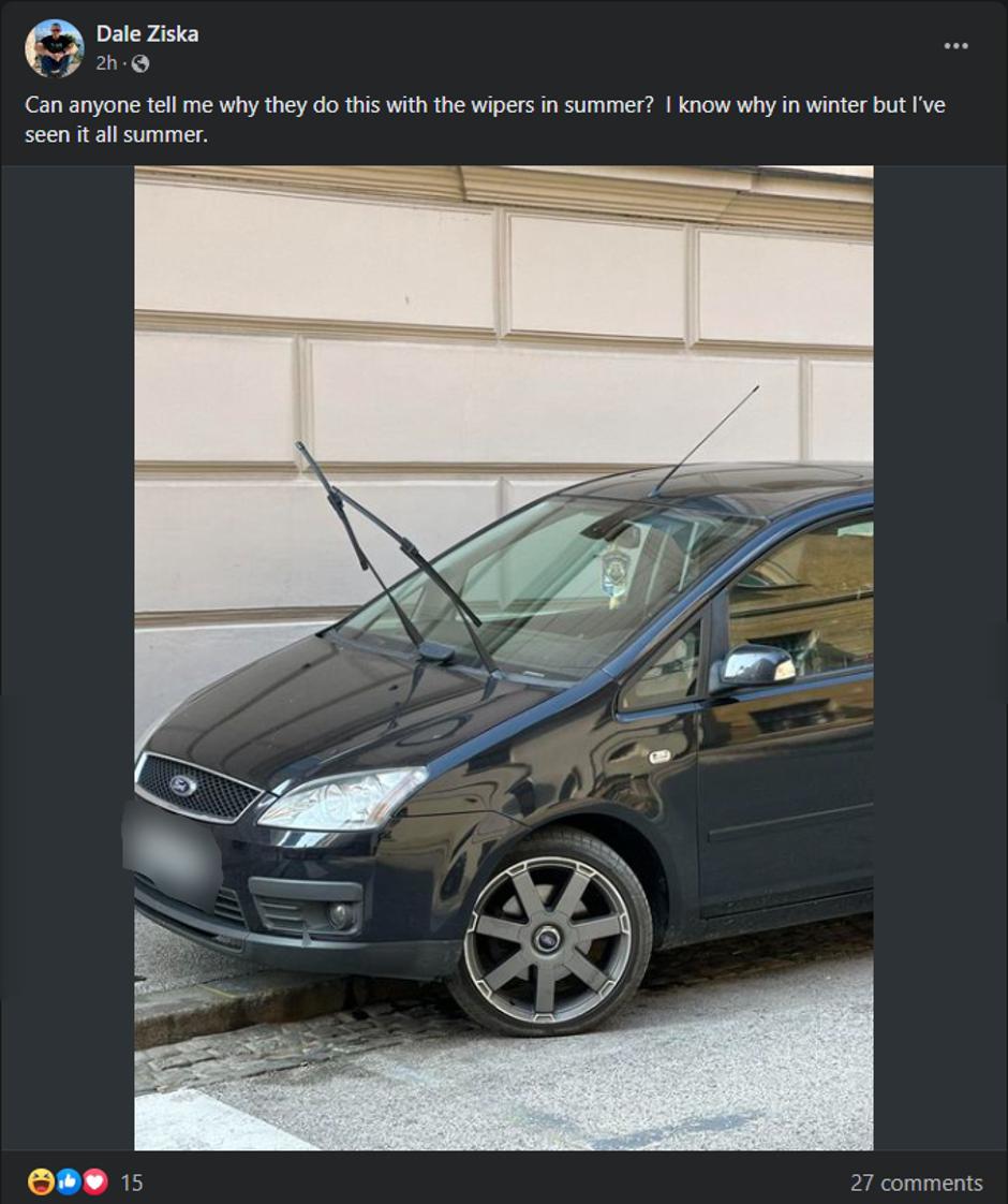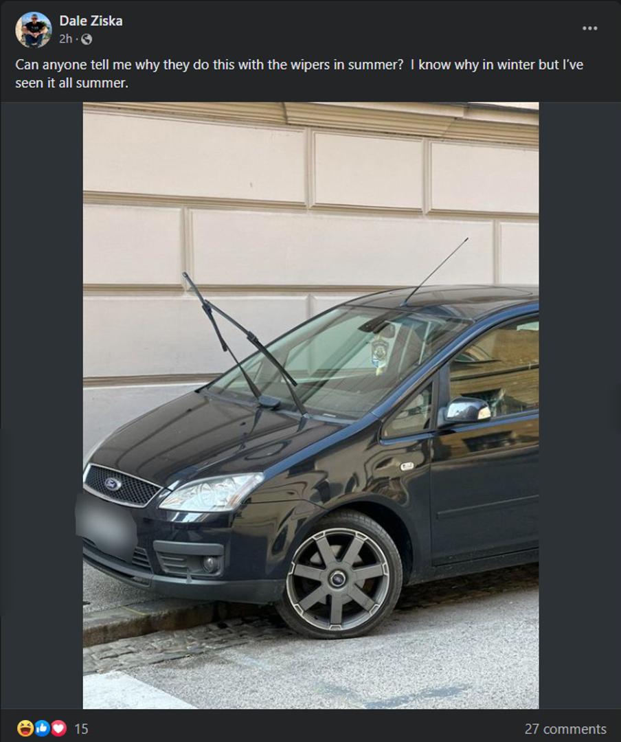 "Može li mi netko reći zašto ovo s brisačima rade ljeti? Znam zašto zimi, ali viđam ovo cijelo ljeto" napisao je Dale Ziska u grupu Expats in Zagreb Official uz sliku parkiranog automobila kojemu su brisači podignuti, a za odgovor nije morao dugo čekati.