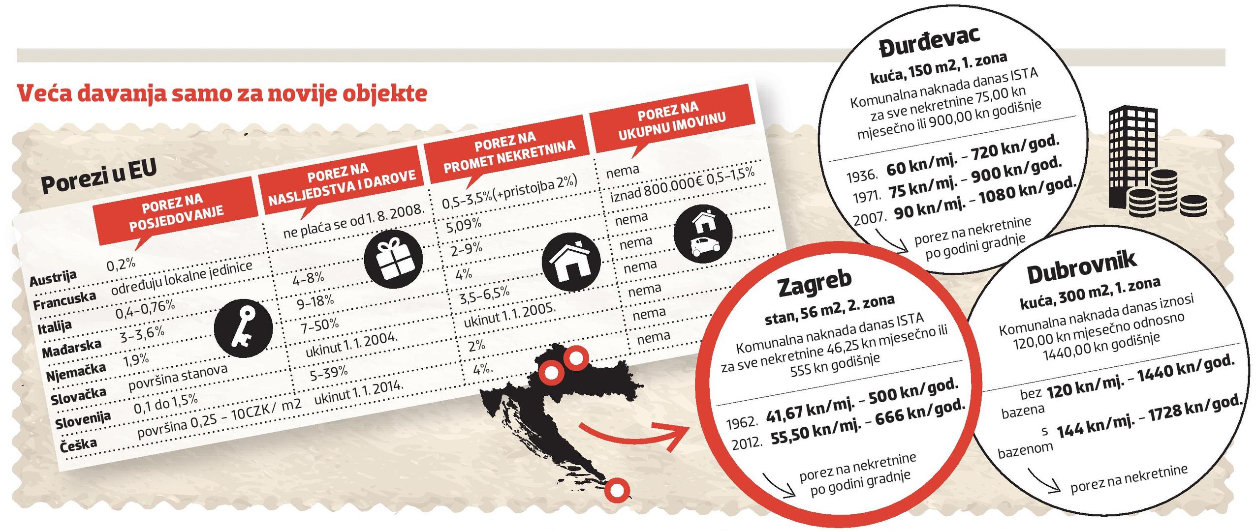 Primjerice, porez na starije i trošne nekretnine bio bi 36 posto niži od sadašnje komunalne naknade, dok bi porez za novije i luksuzne nekretnine bio 44 posto veći. Konkretno, za kuću od 300 kvadrata u prvoj dubrovačkoj zoni iz 90-ih godina porez na nekretnine bio bi kao i sadašnja komunalna naknada od 120 kuna mjesečno, odnosno 1440 kuna godišnje. S bazenom uz kuću porez se penje na 144 kune mjesečno, odnosno 1728 kuna godišnje. Za kuće od 150 kvadrata u prvoj zoni Đurđevca komunalna je naknada 75 kuna mjesečno ili 900 kuna godišnje, neovisno o godini gradnje i stanju. Po novome, za starije bi kuće porez bio 60 kn mjesečno ili 720 kn godišnje, a za novije 90 kn mjesečno ili 1080 kn godišnje. Za 56 kvadrata stana u drugoj zagrebačkoj zoni komunalna je naknada 46,25 kuna mjesečno ili 555 kuna godišnje, a po novome obveza za stan iz 1962. godine pojeftinila bi na 41,67 kuna mjesečno (500 kuna godišnje), a za stan iz 2012. poskupjela na 55,50 kuna mjesečno, odnosno 660 kuna godišnje.