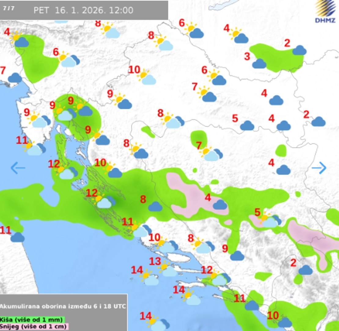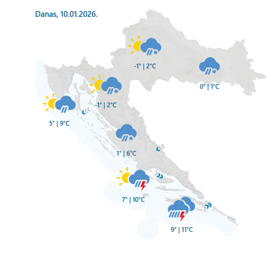 Prema prognozi DHMZ-a, unutrašnjost zemlje u prvom dijelu dana očekuju oborine, većinom u obliku susnježice i snijega, koje se lokalno mogu smrzavati na hladnoj podlozi. Krajem dana ponovno raste vjerojatnost za snijeg, a mjestimice je moguća i magla. Na Jadranu će padati kiša, osobito na jugu gdje su mogući i pljuskovi s grmljavinom. Najviša dnevna temperatura bit će od 1 do 6 °C, a na Jadranu između 8 i 12 °C.