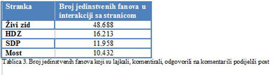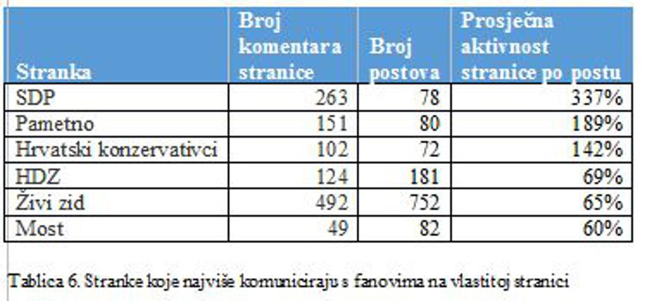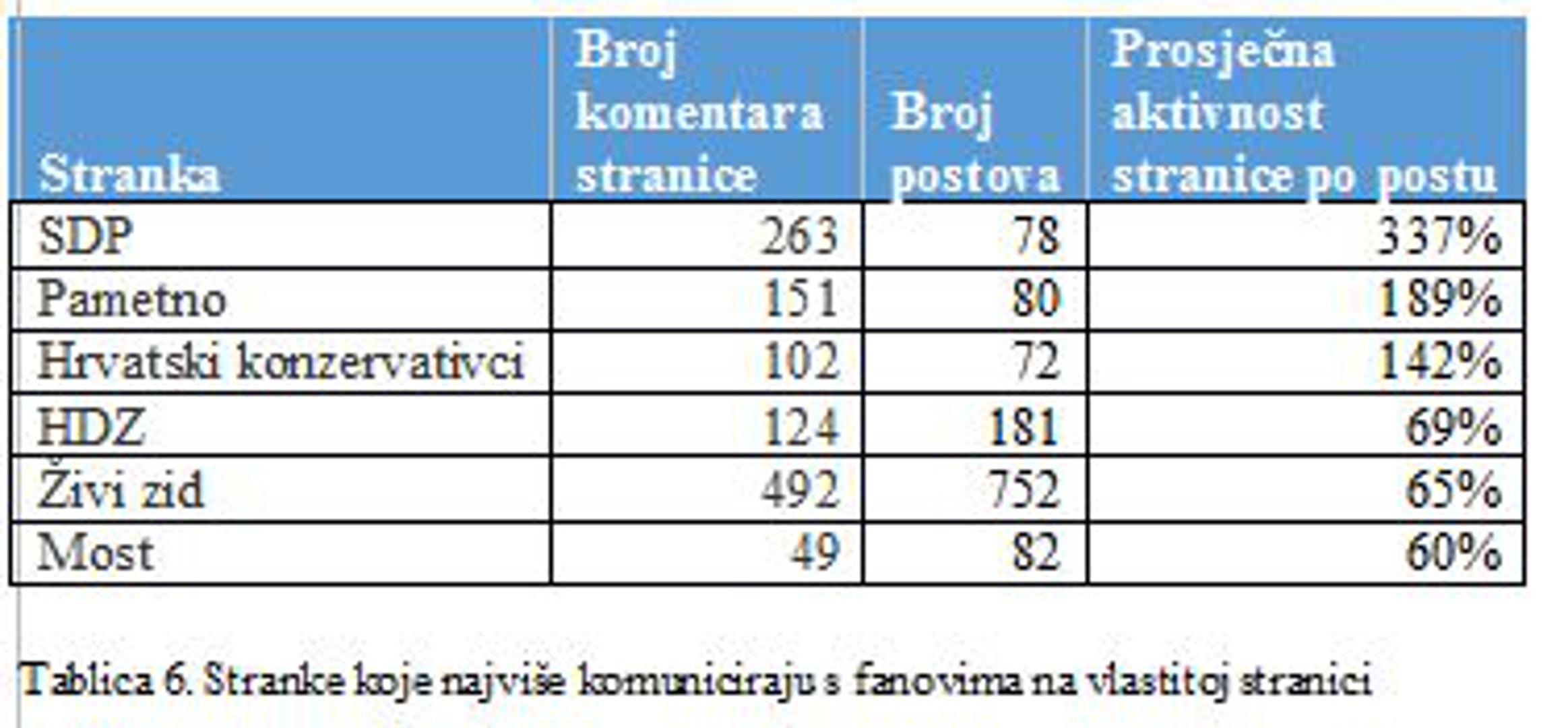Na stranici Živog zida aktivno komunicira gotovo 50.000 jedinstvenih fanova, dok se s velikim brojem jedinstvenih fanova još mogu pohvaliti HDZ, SDP i Most. Na stranicama ostalih stranaka komunicira manje od 5.000 fanova po stranci.
