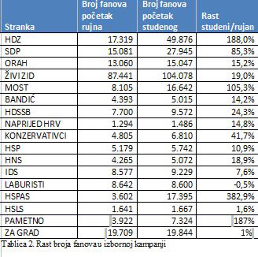 U oglašavanje na Facebooku značajno je uložilo pet stranaka: HSP Ante Starčević, HDZ, Pametno, Most i SDP. Naime to je moguće zaključiti prema postotku rasta njihova broja fanova u 2 mjeseca. Apsolutni rekorder u rastu broja fanova tako je Hrvatska stranka prava Ante Starčević, čiji je broj fanova u 2 mjeseca porastao za 383% (rujan 3.602 fana, a studeni 17.395). HDZ (188%) i Pametno (187%) imali su vrlo sličan postotak rasta fanova, ali HDZ ima sedam puta više fanova i veći doseg nego Pametno. Rast fanova veći od 108 % ostvario je i Most (s 8.105 na 16.642), a povećanjem broja fanova za 85 posto može se pohvaliti i SDP (sa 15.081 na 27.945).