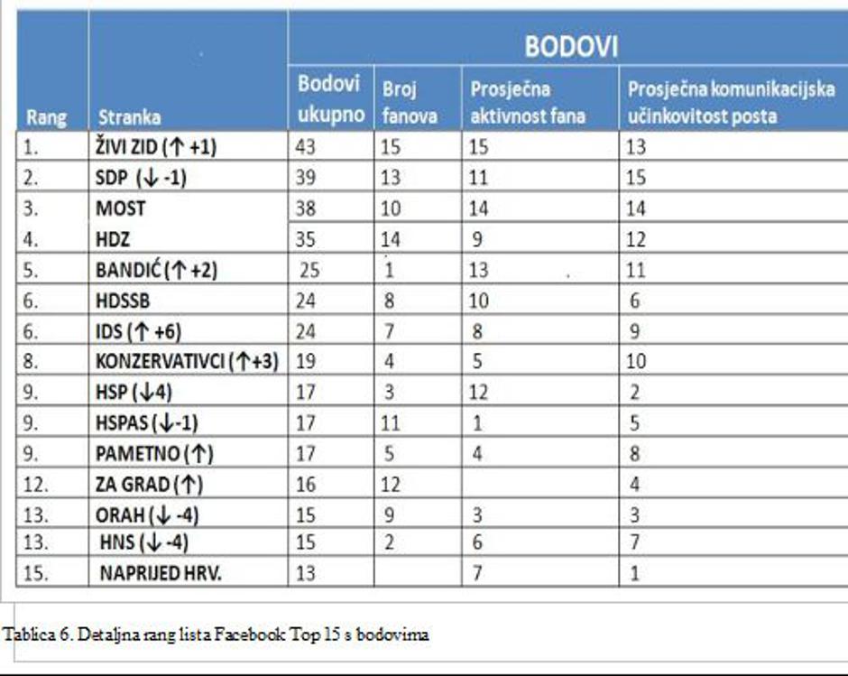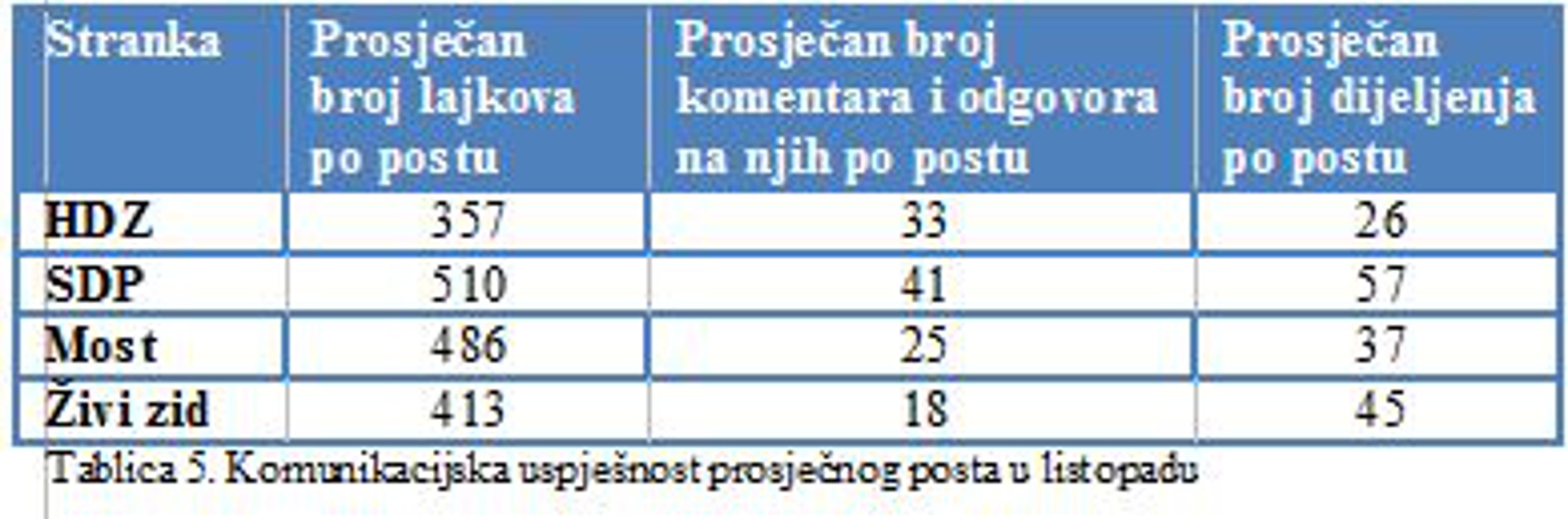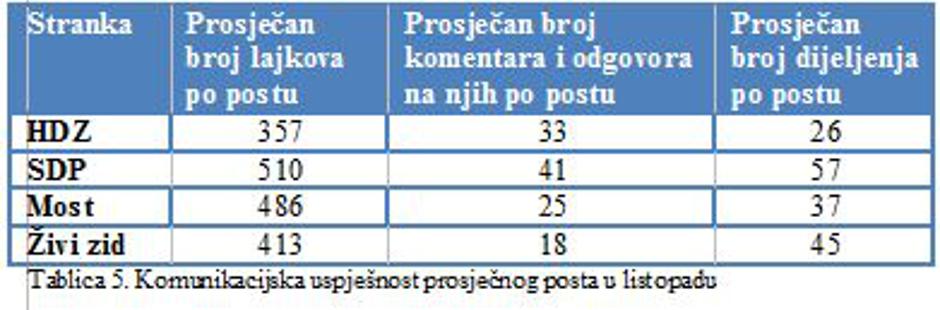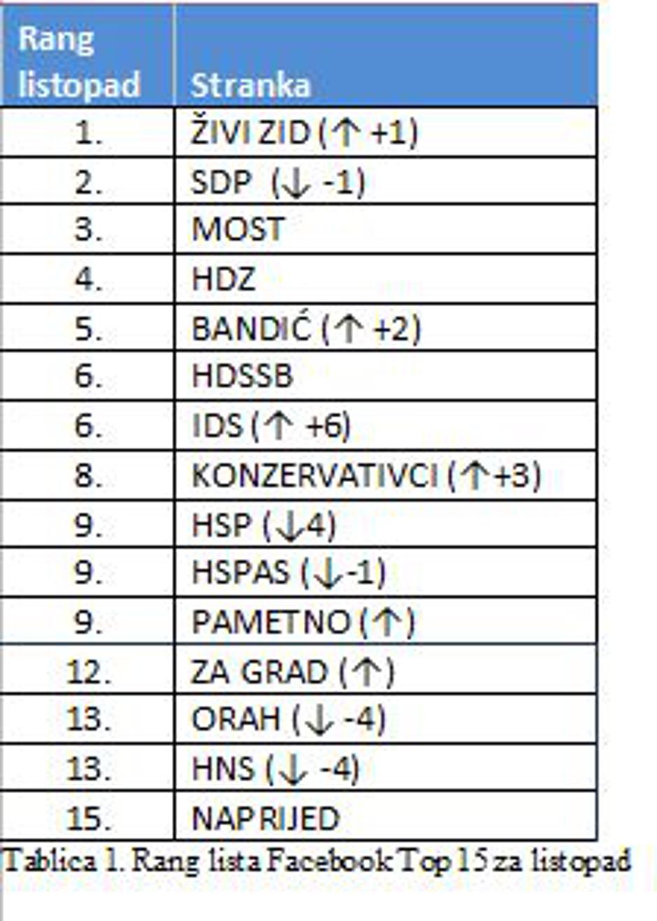 Živi zid, prema podacima za listopad, jači je od SDP-a po broju fanova i po prosječnoj aktivnosti fana (zbroj likeova, komentara i dijeljenja/broj fanova) gdje je osvojio maksimalan broj bodova (15). SDP je najjači po kriteriju komunikacijske uspješnosti prosječnog posta (zbroj likeova, komentara i dijeljenja/broj postova), a u tome je od Živog zida bolji i Most. Most i HDZ zadržali su u listopadu svoje treće odnosno četvrto mjesto iz rujna.