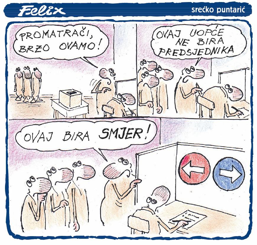 … I da bude stvar zamršenija taj jadnik ne zna više da li da bira 'Lošu prošlost' kao 'Lošu budućnost' ili pak 'Još lošiju prošlost' kao 'Još lošiju budućnost'. Pomognite mu vi. … Uostalom vama se uvijek jednako i crnoo piše. … Dakle, suština vašeg izbora je zapravo 'Kojim lošima birate bolju budućnost'.
