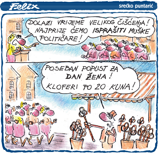 Sretan 8. mart svim ženama i majkama. ... Klofere svakako kupite, sigurno imate koga isklofati u svojoj blizini, a na Pantovčak do daljnjega ne morate ići dok ne vidite kako će se ponašati predsjednica koja se hvalila svojim muškim sposobnostima (nogomet, traktori, vojska ...) .