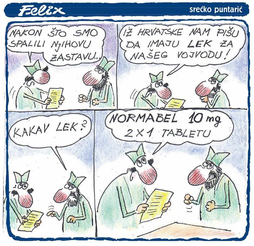 - Poštovani, nakon detaljne analize postupaka i govora od vas cijenjenog i uvaženog Haškog ratnog i genocidnog optuženika, vašeg vojvode, gospodina kojemu smo do jučer propisivali lijek 'Normabel' 10 mg, jutros vam savjetujemo da primijenite za njega daleko efikasnije i jedino za sada ispravno 'terapijsko jahanje', prilagođeno bolesniku kao 'terapijsko tenkiranje' i da mu omogućite 2x1 vožnju ujutro i u večernjim satima ispred Skupštine Srbije, pazeći da ne prekorači maksimalnu brzinu našeg tenka proizvedenog u Đuri Đakoviću. Ovime će on biti posve 'izlečen' i neće više spominjati vožnju tenkom po Hrvatskoj. Cijena našeg tenka je za vas puno manja od štete koju vam dotični čini svojim pričama dok je ovako bolestan. S obzirom na naše spoznaje predlažemo da kupite istovremeno barem još 4 tenka za istu namjenu, tako da ostali pacijenti ne bi dolazili u interne sukobe radi istovremenog korištenja istih.