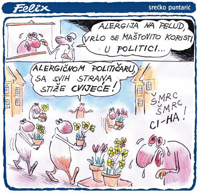 ... Dobro je, političarima alergičnima na pelud stiže cvijeće, samo da alergičnima na opoziciju ne šalju Hrast, Most, Živi zid, Neazaposlene, Blokirane, Ovršene ili Udrugu franak.