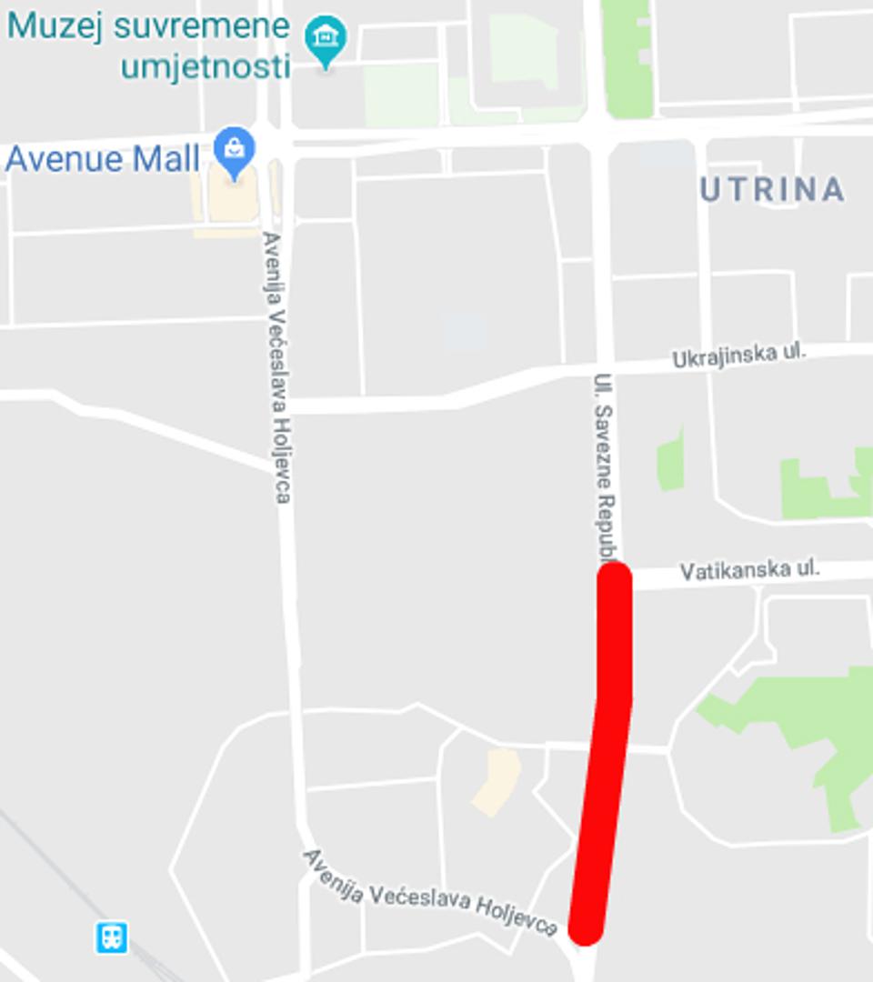 Za potrebe izvođenja radova uređenja zapadnog kolnika na Ulici Savezne Republike Njemačke na dijelu od Vatikanske ulice do Avenije V. Holjevca, od ponedjeljka 27. 08. 2018. godine od 08,00 sati do utorka 28. 08. 2018. godine do 08,00 sati zauzimati će se istočni i središnji prometni trak zapadnog kolnika, a promet će se odvijati po zapadnom prometnom traku zapadnog kolnika, od utorka 28. 08. 2018. godine od 08,00 sati do ponedjeljka 03. 09. 2018. godine do 04,00 sata zapadni kolnik Ulice Savezne Republike Njemačke na navedenoj dionici biti će zatvoren za prometa.