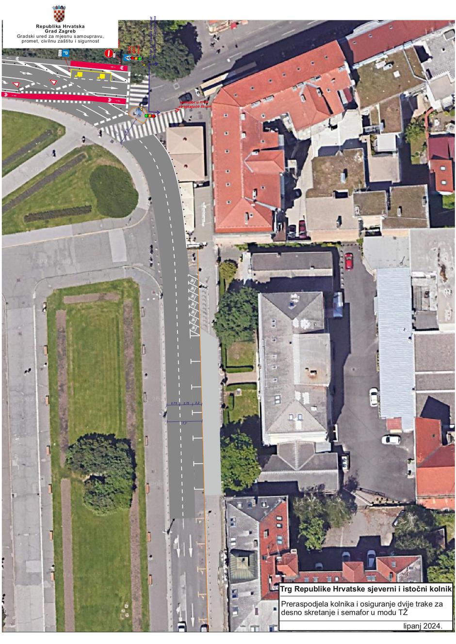 Sjeverni dio Trga Republike Hrvatske će od subote 27. srpnja od 8.00 sati do subote 10. kolovoza 2024. do 18.00 sati biti privremeno zatvoren za sav promet, zbog radova na uređenju kolnika. Naime, izvršit će se korekcija prometnih traka na sjevernom i istočnom kolniku Trga Republike Hrvatske, odnosno osigurat će se dvije trake za skretanje u desno prema zelenom valu, tj. Ulici Andrije Hebranga.