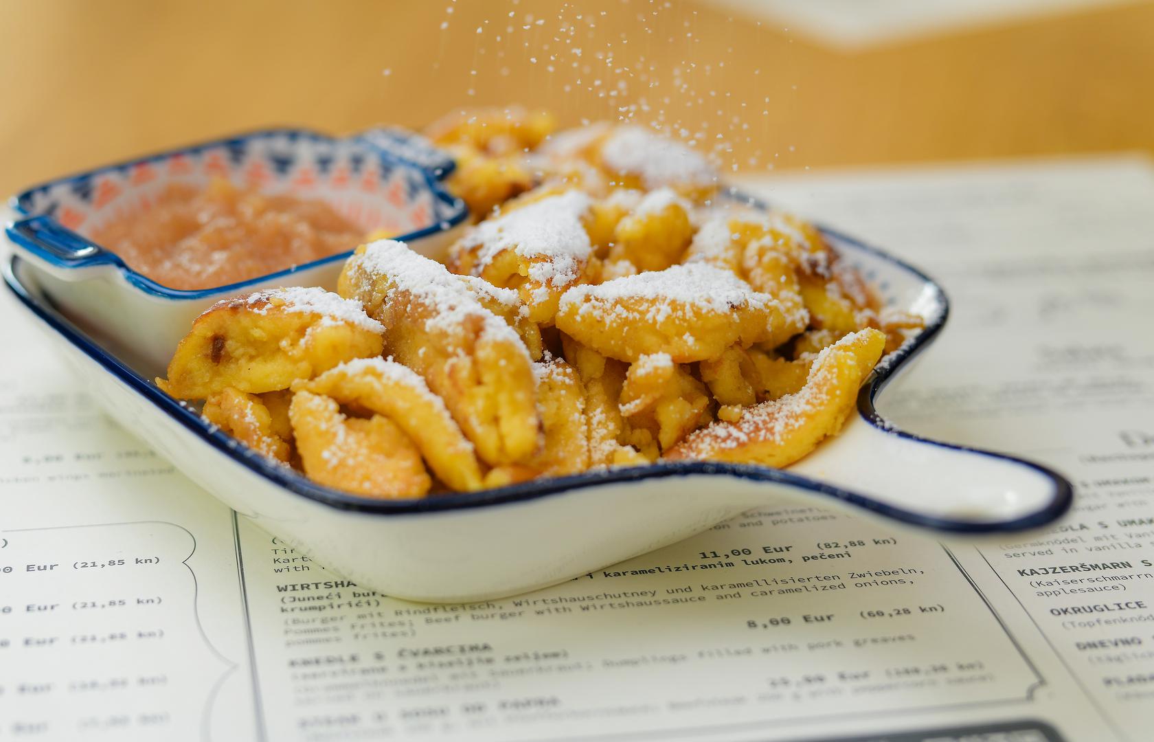 Uz bogat raspon pića i slanih jela, u koja spadaju i juhe te predjela, ipak najveće težište drže na desertima, koji se mogu kušati i prije 12 sati, kada se otvara kuhinja. U ponudi imaju šest, a predvodi ih tradicionalni kajzeršmarn, odnosno kraljevski drobljenac, koji se poslužuje uz mousse od jabuka, a stoji četiri i pol eura. Toliko ćete platiti i nezaobilaznu pitu od jabuka, germknedla košta 4,80 eura, a uz oba deserta poslužuje se umak od vanilije. Liselotte nam kaže da su te tri slastice idealne za zaokruživanje bilo kojeg austrijskog ručka ili večere.
