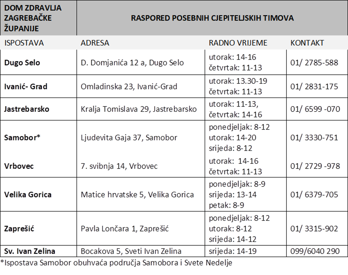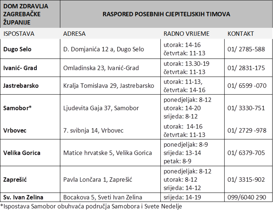 Svi stanovnici Zagrebačke županije koji to žele, od sutra će moć dobiti svoje COVID cjepivo. U svih osam ispostava Doma zdravlja Zagrebačke županije od sutra će biti ustrojeni posebni timovi za cijepljenje koji će raditi u ambulantama posebnog dežurstva te će cijepiti sve zainteresirane stanovnike Zagrebačke županije protiv COVID-19.
