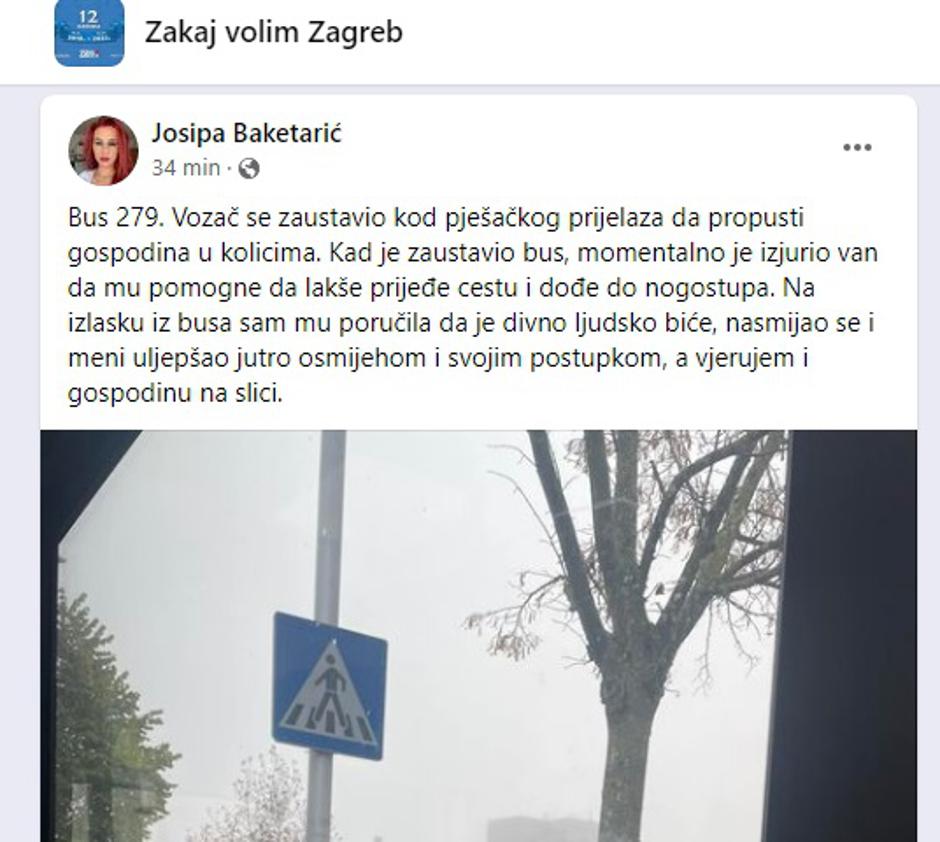 U Facebook grupi Zakaj volim Zagreb, objavljena je priča o predivnoj gesti vozača ZET-ovog autobusa 279. Naime, vozač je bez razmišljanja izjurio van da pomogne muškarcu u invalidskim kolicima na pješačkom prijelazu.