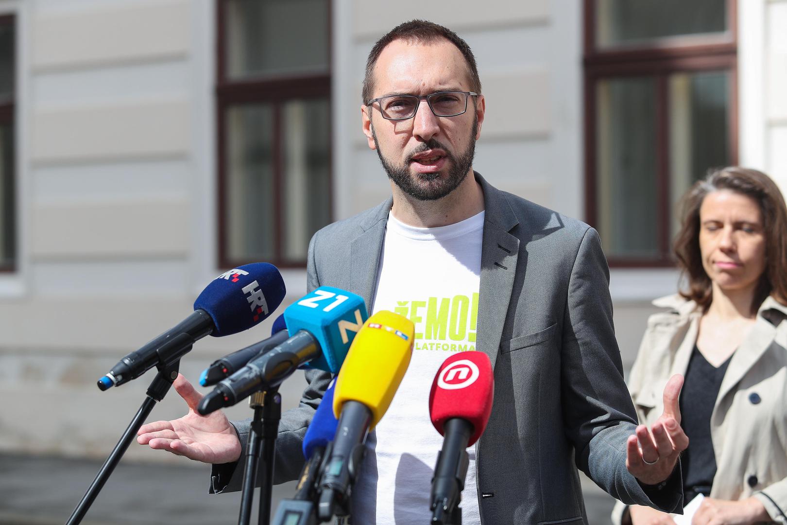 24.05.2020., Zagreb - Na Markovom trgu ispred zgrade Vlade politicka platforma Mozemo na konferenciji za medije govorila je o kljucnim problemima u obnovi Zagreba i okolice nakon potresa, propustima Vlade RH i gradonacelnika u pripremi pravnog, institucionalnog i financijskog okvira za obnovu, problemima u provedbi mjera koje se najavljuju te prijedlozima mogucih rjesenja. Tomislav Tomasevic. Photo: Luka Stanzl/PIXSELL