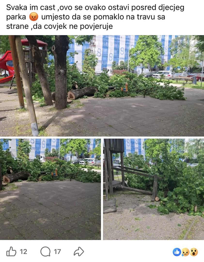 Srušeno stablo i njegove grane ostavljene nasred dječjeg parka u zagrebačkom naselju Trnsko izazvalo je nezadovoljstvo u kvartu. "Svaka im čast, ovo se ovako ostavi posred dječjeg park umjesto da se pomaklo na travu sa strane. Da čovjek ne povjeruje", napisala je Zagrepčanka u kvartovskoj Facebook grupi gdje je podijelila i fotografije.