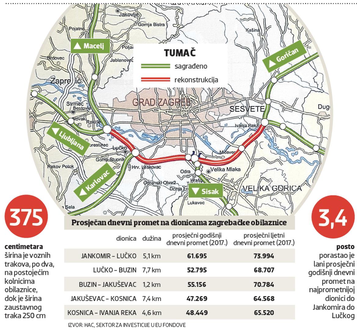 – Pod pretpostavkom da će rekonstrukcija dodavanjem trećeg voznog traka podrazumijevati potpunu zamjenu kolničke konstrukcije i sustava odvodnje, novu prometnu opremu i signalizaciju, uklanjanje i ponovnu izgradnju najvećeg dijela objekata preko i u trupu autoceste, investicijska vrijednost projekta se procjenjuje na 850 milijuna kuna – objašnjava Huzjan. No napominje da će tek po izboru optimalnog tehničkog rješenja i njegove razrade na višim razinama projektiranja biti moguće odrediti vrstu, opseg i dinamiku radova te financijsku vrijednost projekta. A radovi na obnovi i proširenju obilaznice, prema grubim procjenama u HAC-u, mogli bi početi za dvije godine.