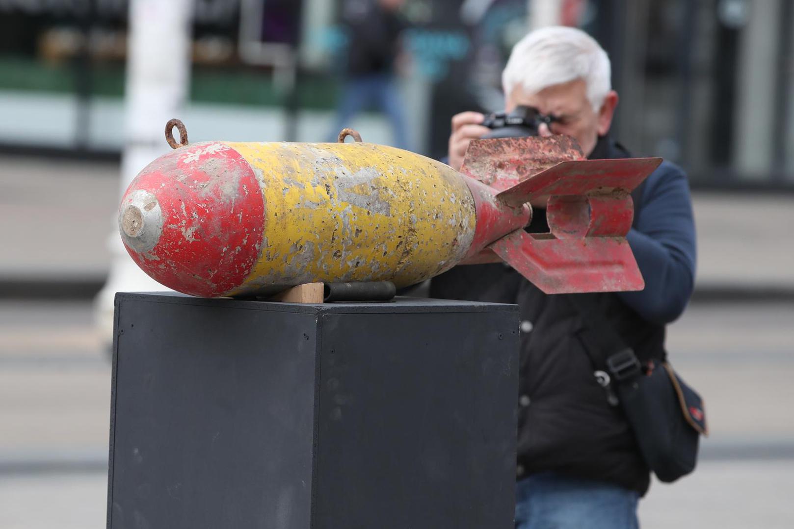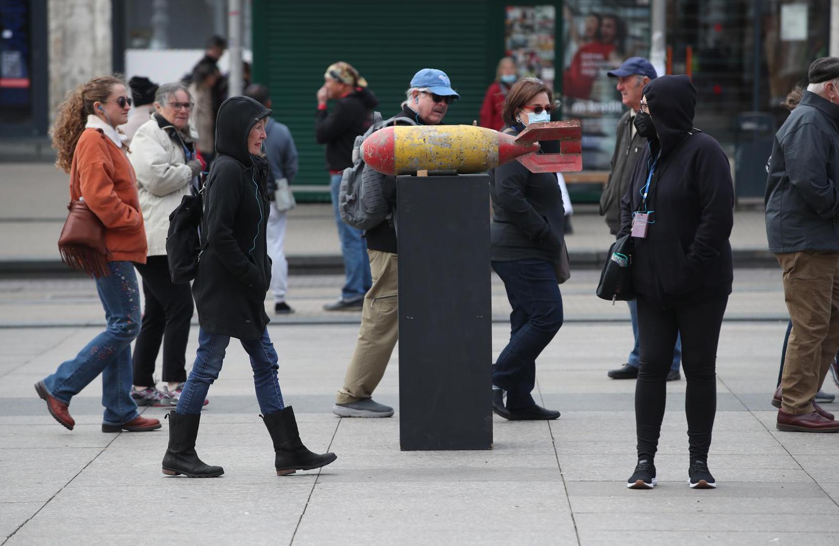 Na sred Trga bana Josipa Jelačića postavljeno je crno postolje na vrhu kojega je montiran metalni objekt koji oblikom podsjeća na bombu, točnije projektil.