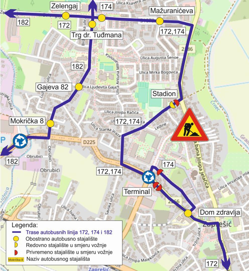- Linija 174 HRUŠEVEC KUPLJENSKI - redovnom trasom do Ulice Pavla Lončara - Ulica Drage Švajcara - ULICA MIHOVILA KRUŠLINA (terminal Zaprešić) - Ul. Ante Starčevića - Ul. Pavla Lončara - Ul. Vladimira Novaka - Ul. bana Josipa Jelačića te dalje redovnom trasom za HRUŠEVEC KUPLJENSKI. Privremeno se uspostavlja obostrano autobusno stajalište "Terminal" u Ulici Pavla Lončara, u zoni raskrižja s Ulicom Ante Starčevića te stajalište "Stadion" u Ulici Vladimira Novaka, u smjeru Zelengaja. Početno/ krajnje stajalište bit će u Ulici Mihovila Krušlina u zoni raskrižja s Ulicom Ante Starčevića. Nakon završetka ovih radova, linija 174 prometovat će djelomično obilazno prema obavijesti od 11. travnja, zbog sanacije kolnika Ul. Matije Gupca u Pojatnom;