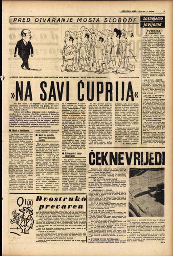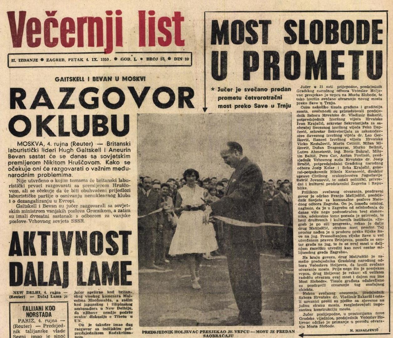 „Jučer je svečano predan prometu četverotračni most preko Save u Trnju“, napisao je, prije 65 godina, Večernjakov novinar, N. Misaljević. Taj arhivski članak, na požutjelom novinskom papiru i danas svjedoči o danu kada je, u 11 sati prijepodne, tadašnji predsjednik Gradskog narodnog odbora i otac Novog Zagreba, Većeslav Holjevac, pred tisućama okupljenih građana, presjekao vrpcu te svečano otvorio most, kojemu je dao ime Most Slobode.
