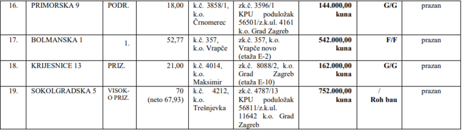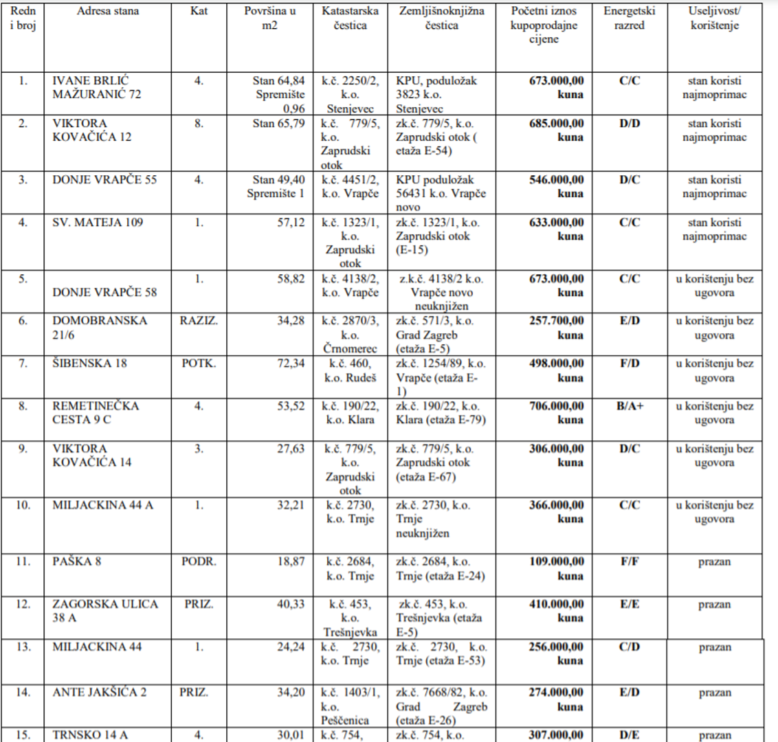 Najjeftiniji je stan u Paškoj 8 u kvartu Trnje, početni iznos kupoprodajne cijene jest 109.000 kuna. Nešto je skuplji stan u Primorskoj ulici 9 u kvartu Črnomerec. Početna cijena mu je 144.000 kuna. Stan na Maksimiru u ulici Krijesnice 13 ima početnu cijenu 162.000 kuna. Najskuplji stan je pak u Sokolgradskoj ulici 5 u kvartu Trešnjevka. Početna cijena mu je 752.000 kuna, a ima oko 70 kvadrata.