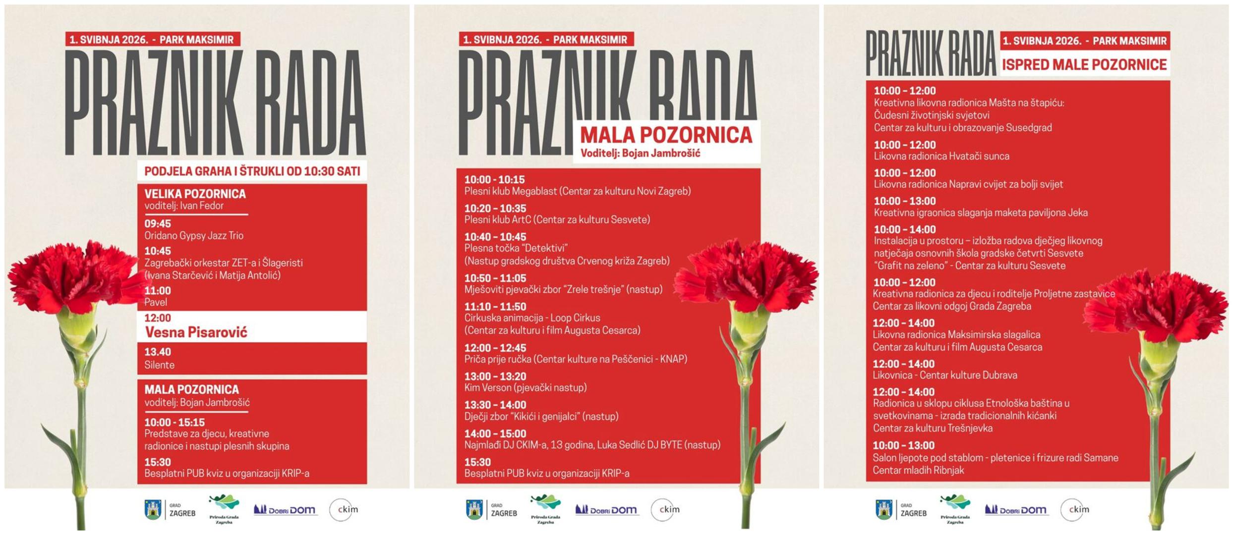 Grad Zagreb i ove će godine obilježiti Međunarodni praznik rada u parku Maksimir 1. svibnja, uz cjelodnevni glazbeni i zabavni program te tradicionalnu podjelu prvomajskog graha i štrukli. Program se organizira u suradnji s ustanovama Priroda Grada Zagreba, Dobri dom i Centar za kulturu Maksimir, a odvijat će se na dvije pozornice. Glazbeni program započinje već na ulazu u park, gdje će Zagrebački orkestar ZET-a krenuti sa svirkom i u povorci proći alejom do glavne pozornice. Na velikoj pozornici potom će nastupiti Oridano Gypsy Jazz Trio, Šlageristi uz Zagrebački orkestar ZET-a, a nakon njih i grupa Pavel, objavio je Grad na službenim stranicama.