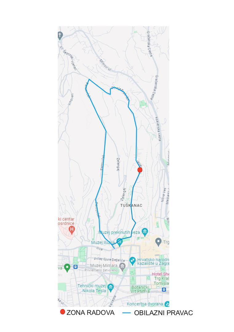 Ulica Tuškanac na dijelu ispred kućnog broja 62, danas, u nedjelju 3. ožujka je zatvorena za sav promet zbog izvođenja radova na hitnoj sanaciji vodoopskrbnog cjevovoda. Obilazni pravci za vrijeme radova su: