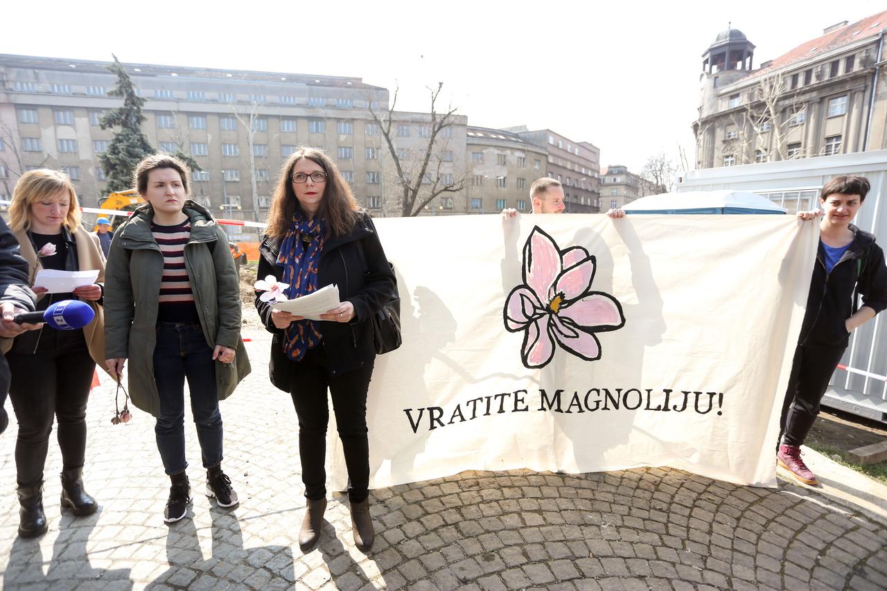 Inicijativa Vratite magnoliju pozvala je u srijedu nadležne zagrebačke institucije da obustavu radove na Trgu žrtava fašizma i detaljno predstave projekt uz široku javnu raspravu kako bi se zaštitio zdravi biljni fond i cjelokupni prostor oko paviljona, ali i u drugim dijelovima grada gdje su predviđeni radovi.