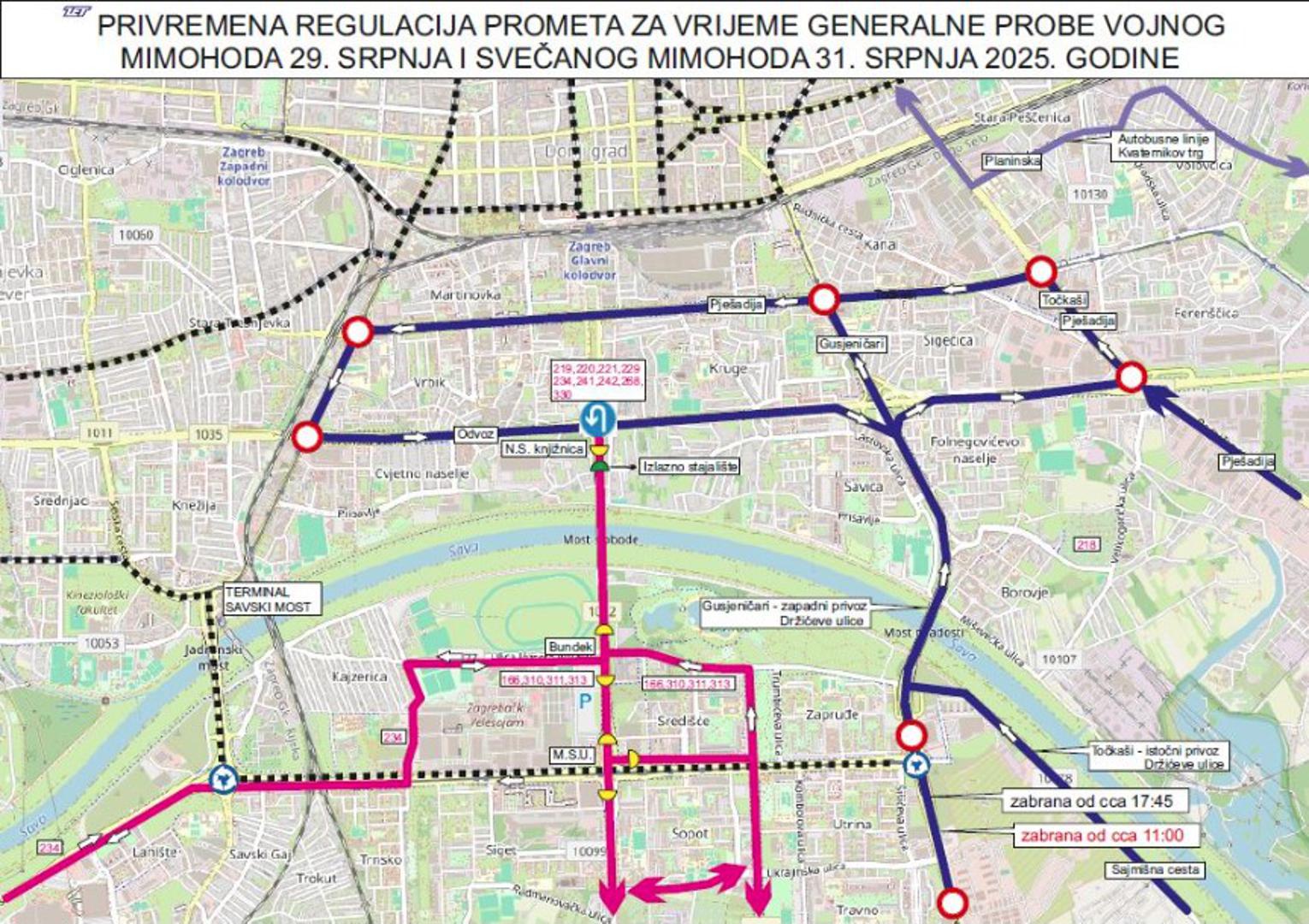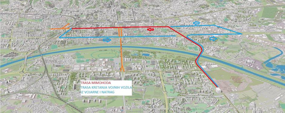 Sarajevska, Most mladosti, Avenija Marina Držića zatvaraju se za promet od 17:15 do 23:00 radi izlaska vojnih vozila iz vojarne prema Ulici grada Vukovara. Sajmišna cesta od vojarne 1. gardijske brigade Tigrovi - Croatia do Mosta mladosti zatvara se za sav promet u vremenu od 17:45 do 19:00. Južni kolnik Slavonske avenije od Avenije Marina Držića do Heinzelove biti će zatvoren za promet od 17:45 do 19:15 zbog prolaska vojnih vozila. Ulica Vjekoslava Heinzela od Slavonske avenije do Ulice grada Vukovara bit će zatvorena za promet od 17:45 do 19:15 zbog prolaska vojnih vozila. Ulica grada Vukovara od Heinzelove do Savske ceste zatvara se za sav motorni promet od 17:45 do 22:00. Avenija Većeslava Holjevca se zatvara od Slavonske avenije do Damira Tomljanovića od 21:00 do 23:00.Slavonska avenija se zatvara na dijelu od Savske ceste do Heinzelove od 21:00 do 23:00.