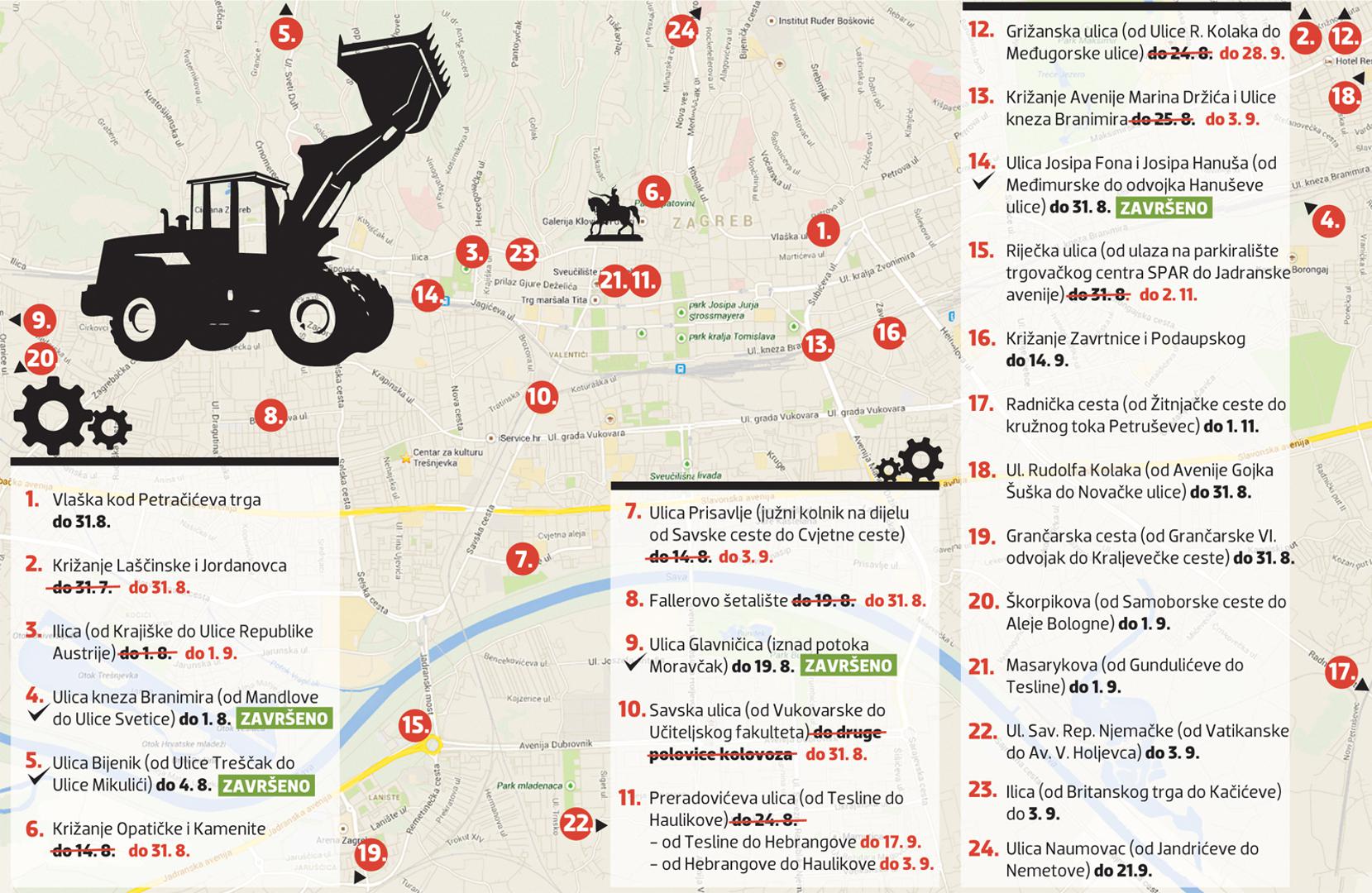 I tako unedogled. Scenarij je to koji se odigrava svako ljeto u Zagrebu, pa je potkraj kolovoza u gradu toliko gradilišta da je nemoguće okrenuti se a da ne naletite na neki bager, raskopanu cestu, komade asfalta... Isto je i ove godine, a koliko je situacija kritična govori to da su od ukupno 17 gradilišta koliko ih je bilo otvoreno potkraj srpnja, do danas zatvorena samo – četiri.
