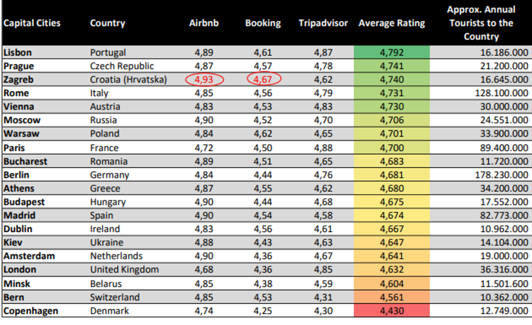 Naime, s obzirom na to da su, s pojavom pandemije, zahtjevi oko higijene putovanja dodatno narasli, provedeno je istraživanje prema ocjenama korisnika platformi za rezerviranje smještaja: Airbnb, Booking.com i Tripadvisor. Istraživanje je objavio britanski portal ShowersToYou.co.uk, a temelji se na prosjeku ocjena čistoće smještaja u popularnim europskim glavnim gradovima. U ukupnom poretku od 20 najčišćih odredišta u Europi, Zagreb je zauzeo visoko 3. mjesto s prosjekom od 4,740, a ispred su samo Lisabon s prosjekom ocjena od 4,792, dok je na drugom mjestu Prag s gotovo identičnom ocjenom kao Zagreb, tj. prosjekom od 4,741.