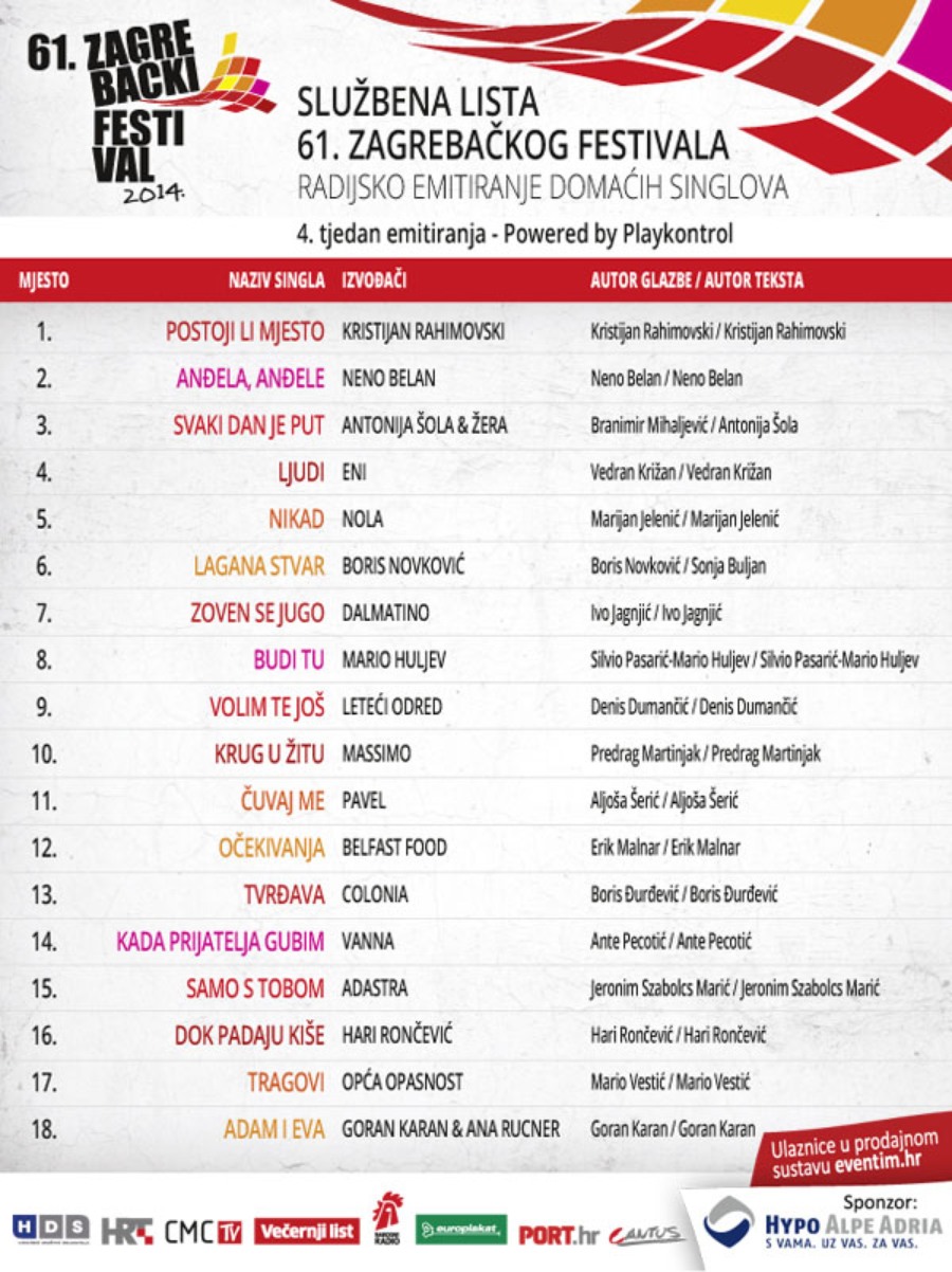 Značajne skokove zabilježili su Mario Huljev s pjesmom Budi tu te Massimo i njegova Krug u žitu. Također, posebno veseli afirmacija pjesama Zagrebačkog festivala na HR TOP 40, službenoj nacionalnoj listi domaćih singlova, a to su, već spomenuti Kristijan Rahimovski, Neno Belan i Antonija Šola & Žera te ENI – Ljudi, Nola – Nikad, Dalmatino – Zoven se jugo, Leteći Odred – Volim te još, Mario Huljev – Budi tu, Adastra – Samo s tobom, Vanna – Kada prijatelja gubim i Massimo – Krug u žitu.