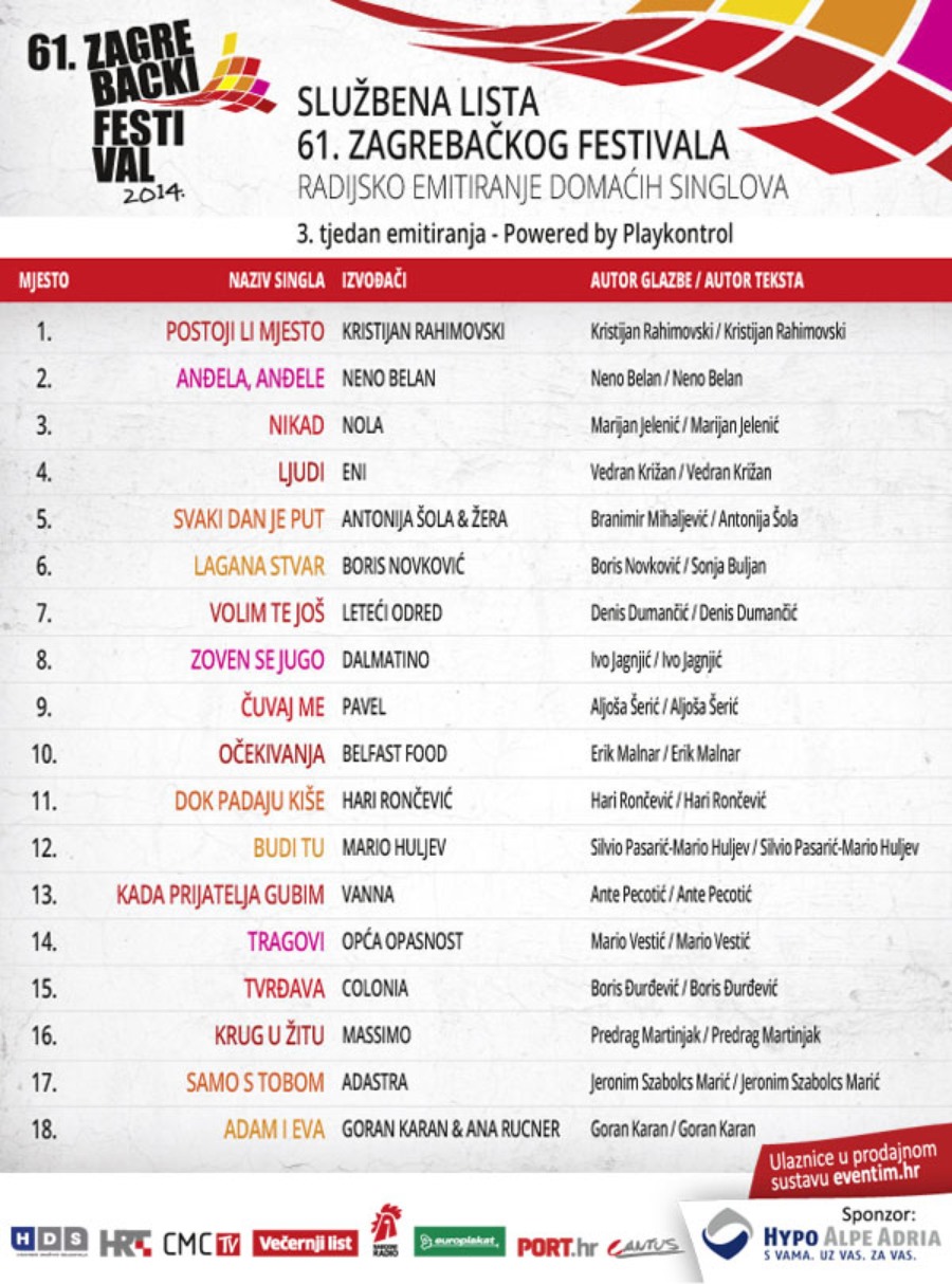 U trećem tjednu emitiranja, na vrh top liste pjesama Zagrebačkog festivala zasjeo je Kristijan Rahimovski s pjesmom Postoji li mjesto. Neno Belan i njegova Anđela, anđele čvrsto drži drugo mjesto, dok je pulska Nola ovog tjedna na trećem mjestu s pjesmom Nikad.