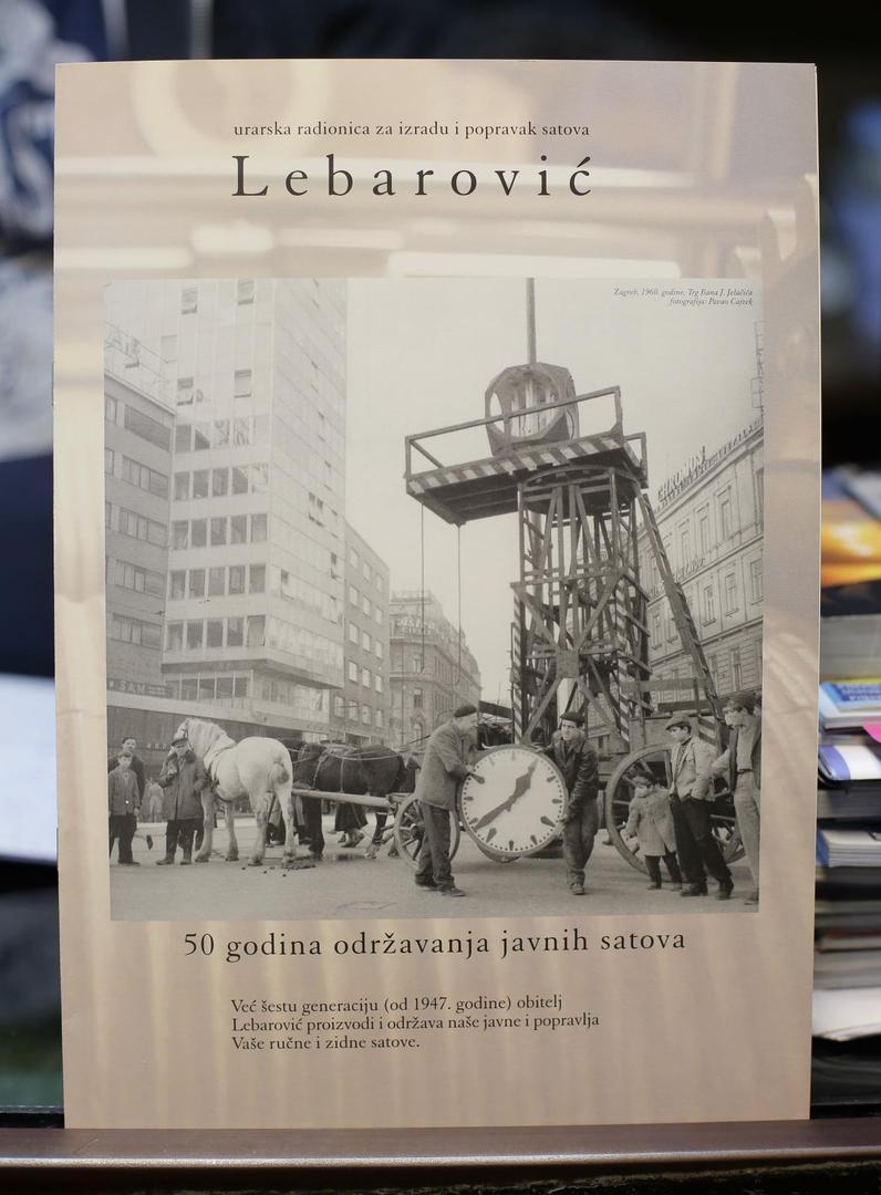 – Bilo je to prije četrdesetak godina, pitanje je je li još “živ” – priča otac Lebarović, koji se više i ne sjeća koliko mu je satova tijekom godina prošlo kroz ruke. No svaki koji su popravili zapisuju u knjižicu, u kojoj piše i njihova “dijagnoza” te sve što o njemu znaju. Tako su zabilježili i priču o satu na Jelačić-placu, koji je Zlatko Lebarović 1960. godine mijenjao s ocem Simeonom uz pomoć ZET-ovih radnika, koji su sat dovezli s kočijom. Zabilježio je to fotoaparatom legendarni Večernjakov fotoreporter Pavao Cajzek, a fotografija još stoji u izlogu u Maksimirskoj.