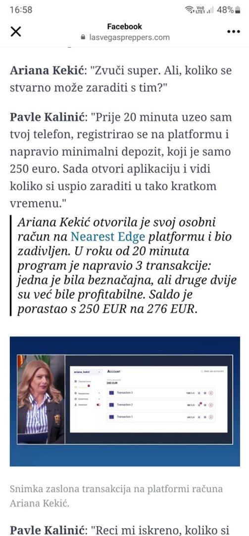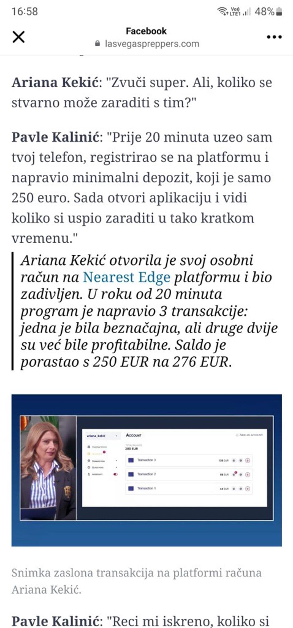 "Bio sam u muzeju kad sam dobio poruku od Ariane Kekić kod koje sam bio u podcastu. I htio sam demantirati dezinformacije", rekao nam je Kalinić. Osim Facebook postova u kojima se navodi da više nije živ, društvenim mrežama počeo se dijeliti i lažni invervju s Kekić u kojem se on navodno našao u "skandalu" jer je otkrio tajnu obogaćivanja putem jedne aplikacije.