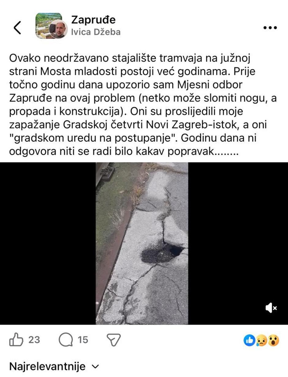 U Facebook grupi zagrebačkog kvarta Zapruđe jedan se pratitelj požalio na dugogodišnji problem zapuštenog južnog tramvajskog stajališta na Mostu mladosti. Riječ je o tramvajskom stajalištu koje je u vrlo lošem i neodržavanom stanju, bez ikakvih vidljivih sanacija ili poboljšanja. U objavi je istaknuo kako je prije godinu dana upozorio Mjesni odbor Zapruđe na ovaj problem, naglasivši kako stanje stajališta predstavlja stvarnu opasnost za građane jer se netko ondje može lako ozlijediti, pa čak i slomiti nogu, dok se u isto vrijeme vidljivo urušava i sama konstrukcija.
