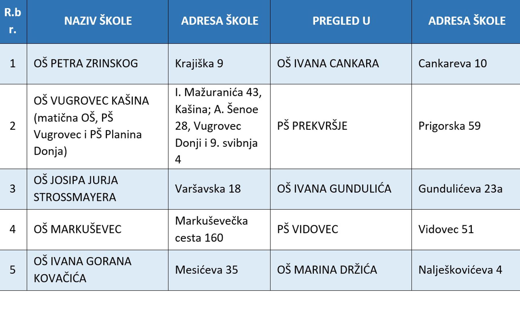 Za učenike osnovnih škola koje su oštećene u potresu pregledi će se odvijati u sljedećim osnovnim školama: