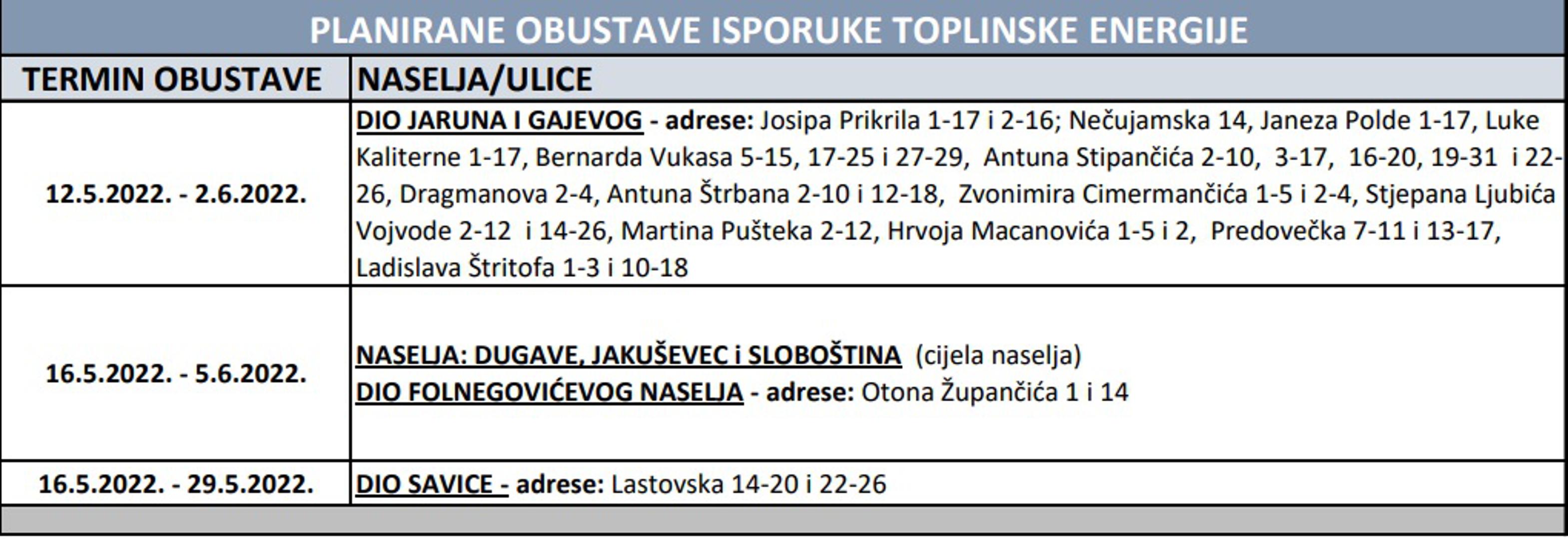 Stigli su i datumi za prve tjedne svibnja i lipnja, te raspored obustave toplinske energije. Radi se o kvartovima Jarun i Gajevo te velik dio Novog Zagreba. Detaljan raspored pogledajte u tablici.